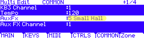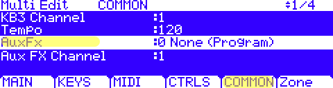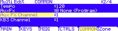 - Press the [COMMON] soft button. Use the PARAM buttons to highlight the “Aux FX Channel”: