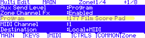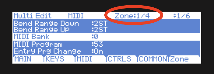 - Press the Zone (soft button) to select the Zone you are trying the alter the Pitch Bend on.Keep your eye on the Zone field parameter in the top center of the screen – this indicates which zone you are editing currently. For ex., in the screen below Zone 1 (of a total of 4) is currently in edit focus.