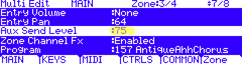 - Use the [previous/-] [next/+] buttons, data wheel and/or alphanumeric keypad, to change the Aux Send Level to any desired amount (range = 0-127). Remember this is the send level for just the currently selected zone:For ex. here we have chosen “75” and this only applies to Zone 3.