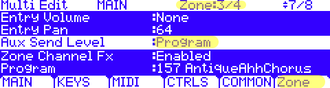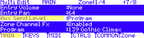 For ex, if the Aux FX Channel parameter is set to Ch1 (the default), then the built-in Aux FX associated with whatever program is on channel 1 of your Multi will be what gets used for all zones of the Multi. This makes it easy to use the same reverb, for ex., for your Multi that the primary program is already using in Program mode.