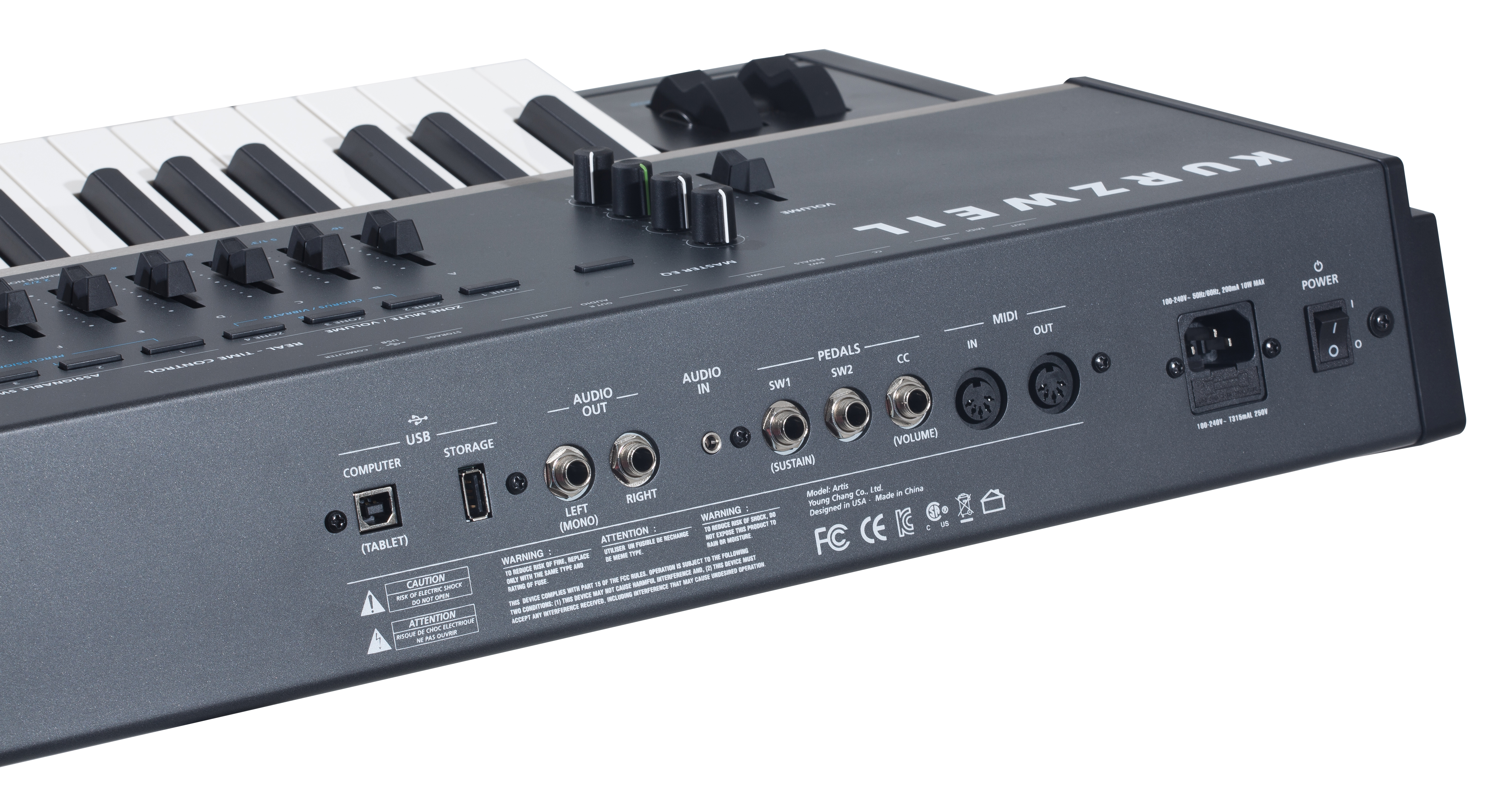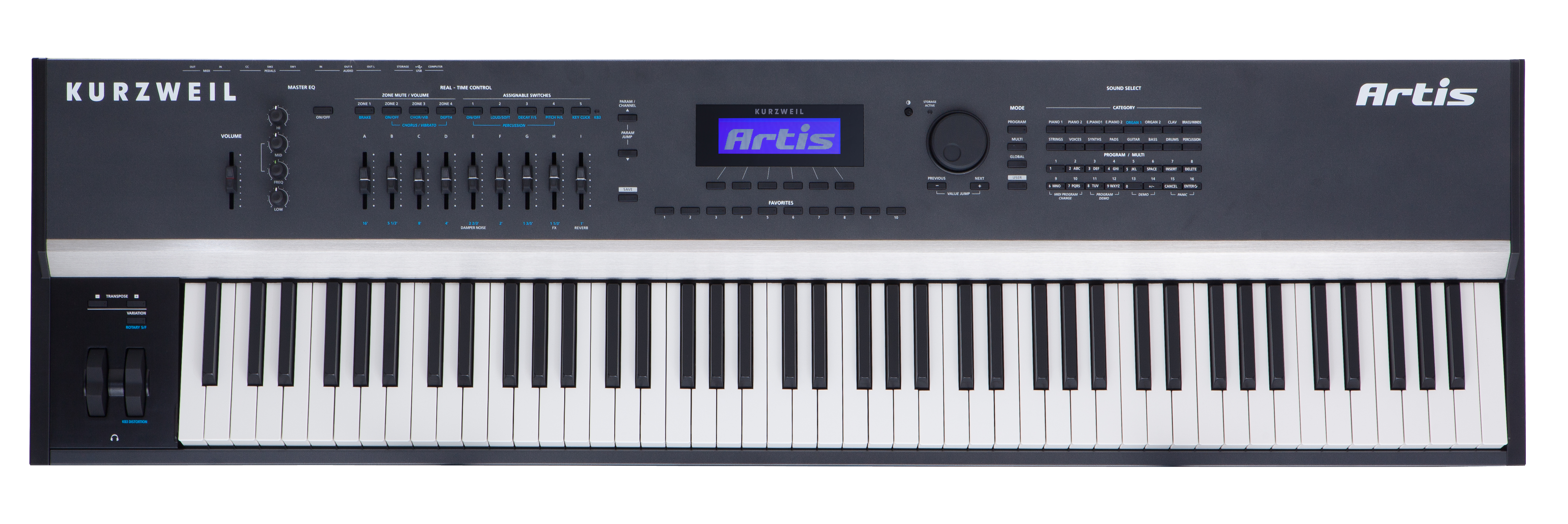 | Controllers: | • 1 pitch wheel • 1 modulation wheel • 9 front panel sliders • 9 KB3 control switches/control/zone mute switches • 1 variation switch • 2 transpose switches • 2 switch pedal inputs, each supporting single or dual, switch or half-damper* pedals (1 switch/sustain pedal is included) • 1 continuous control pedal input(*for MIDI controller functionality only) |