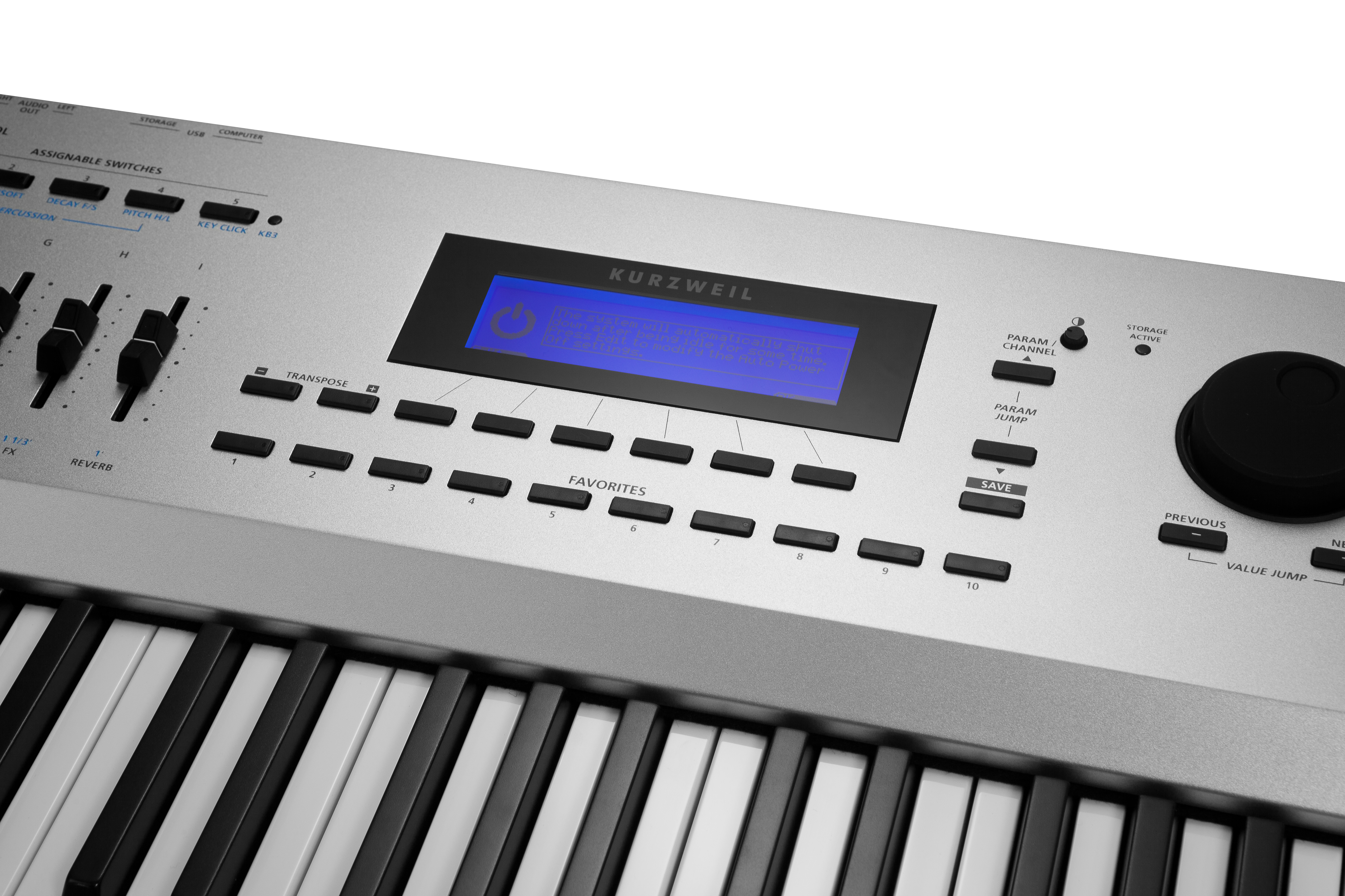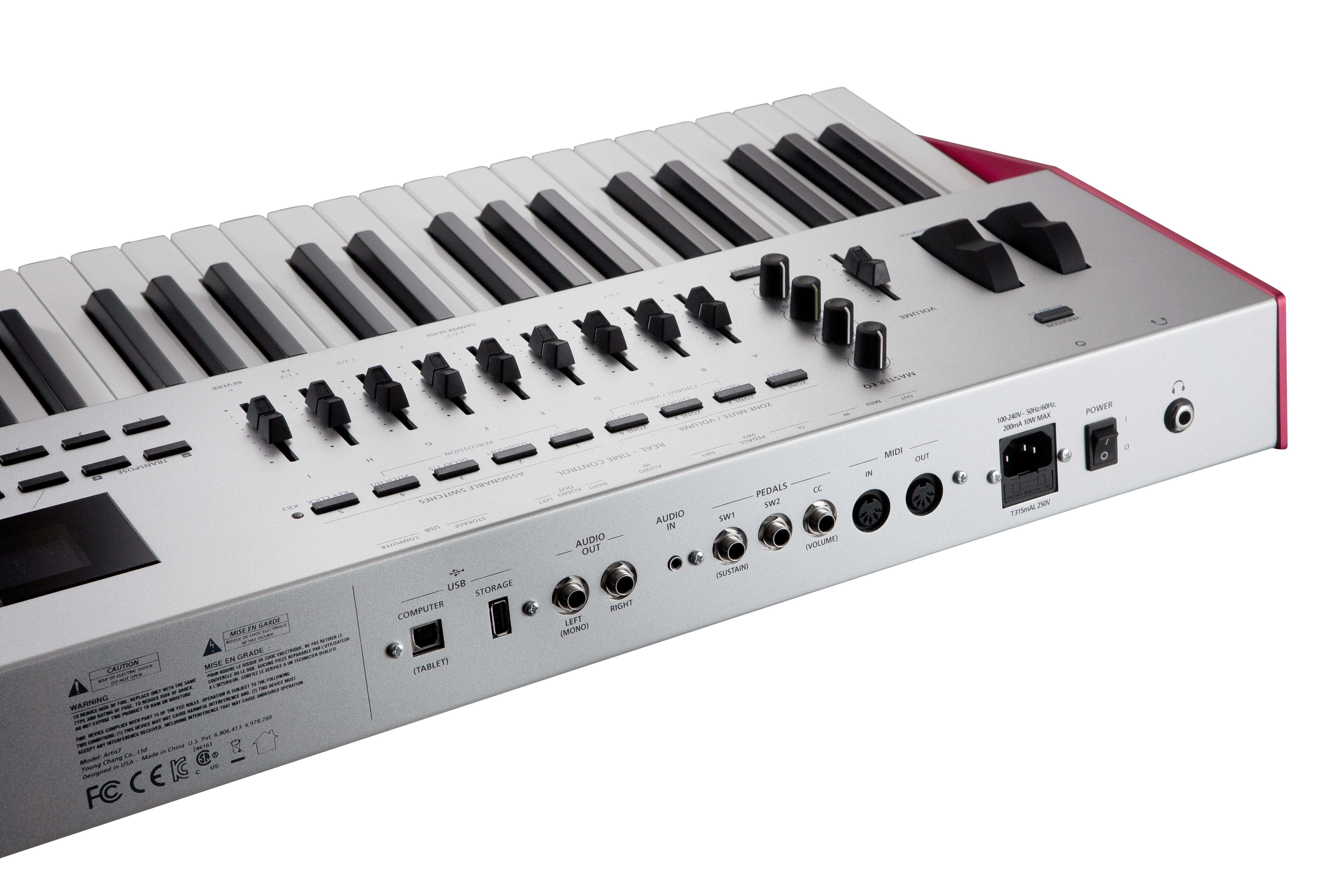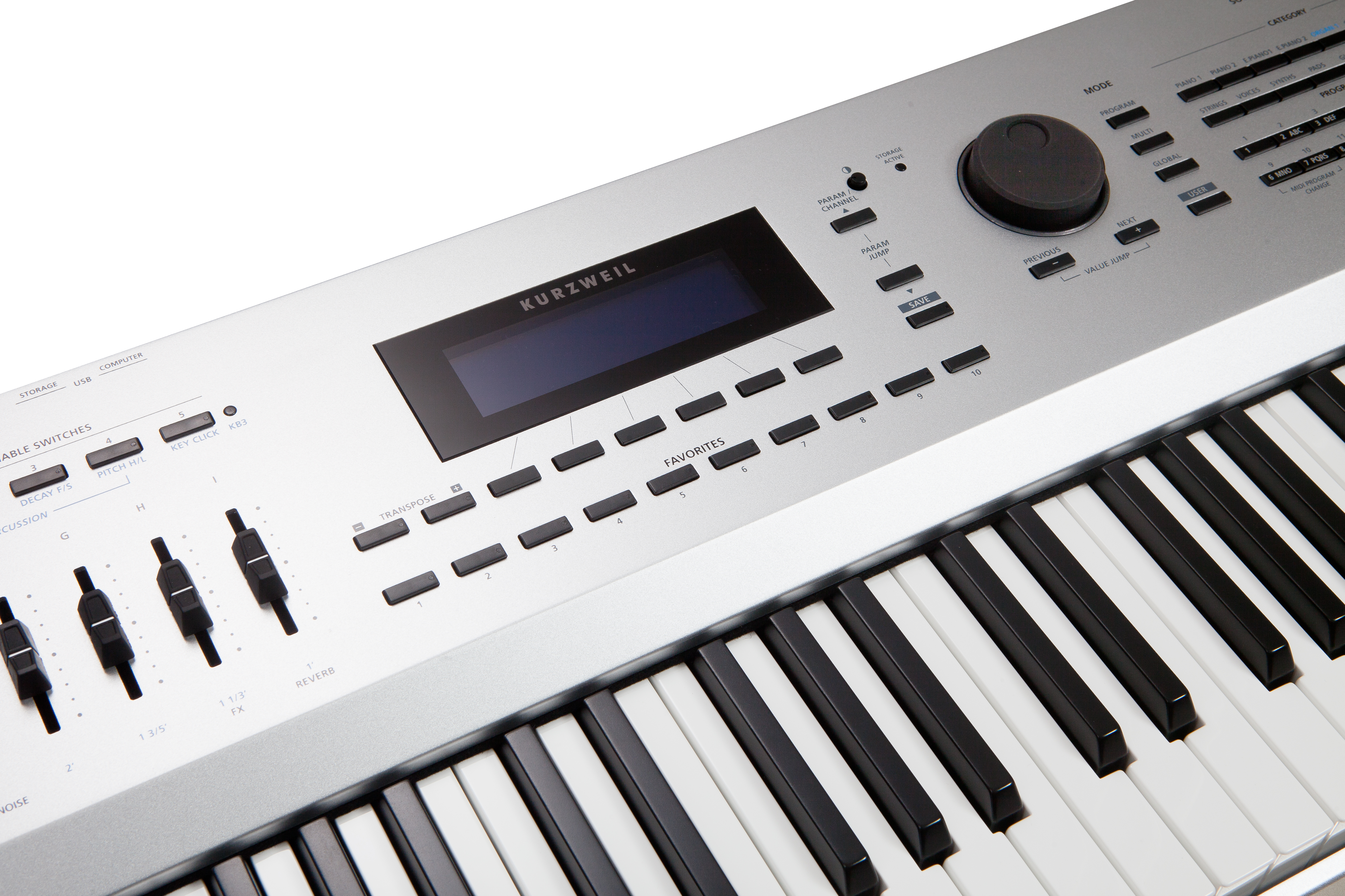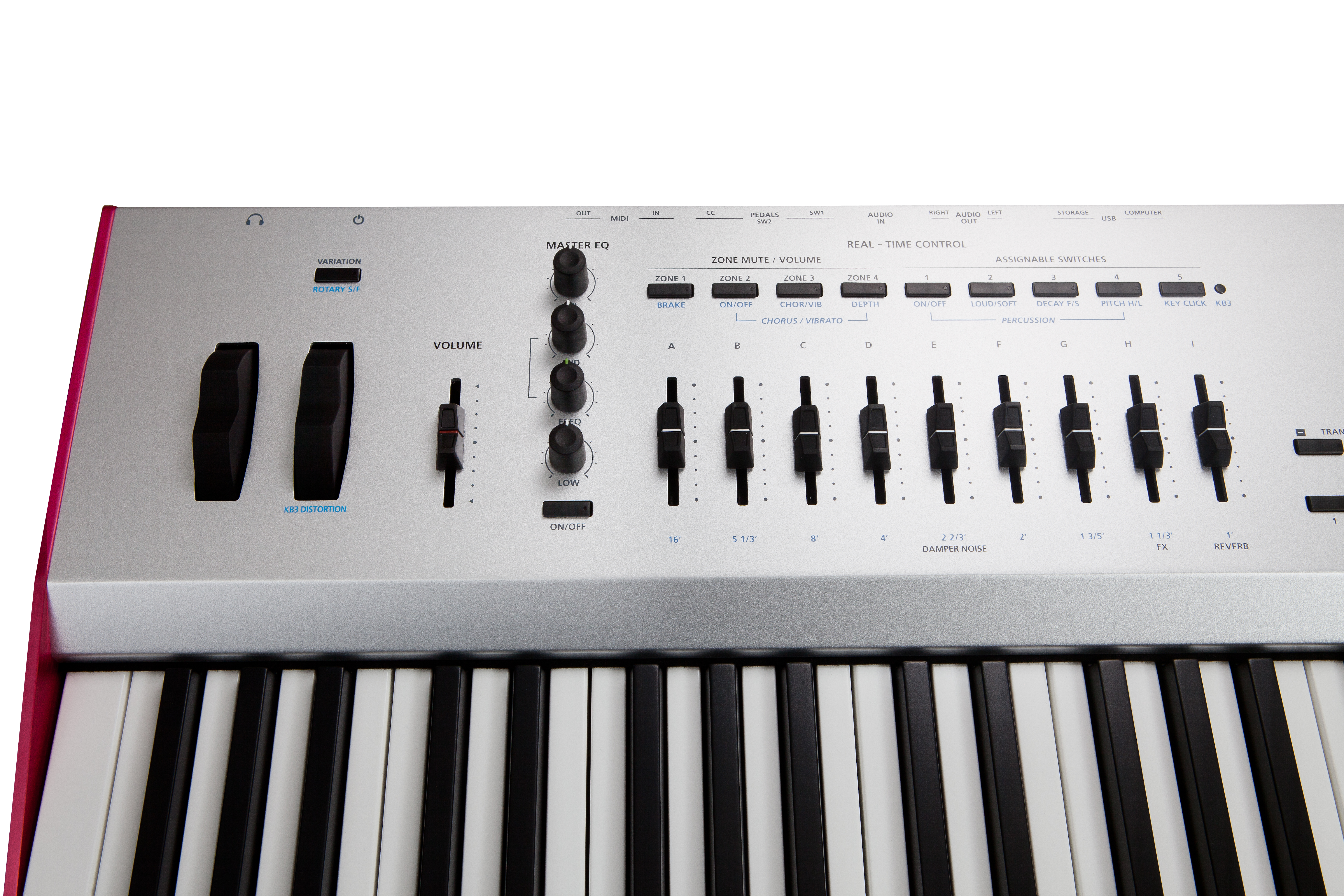 | Controllers: | • Front panel-mounted pitch and mod wheel • 9 front panel sliders • 9 KB3 control switches/control/zone mute switches • 1 variation switch • 2 transpose switches • 2 switch pedal inputs** (1 switch/sustain pedal is included) • 1 continuous control pedal input(** Each switch pedal input supports a single or dual switch pedal, or a single half-damper* pedal. Half-damper for MIDI output only.) |