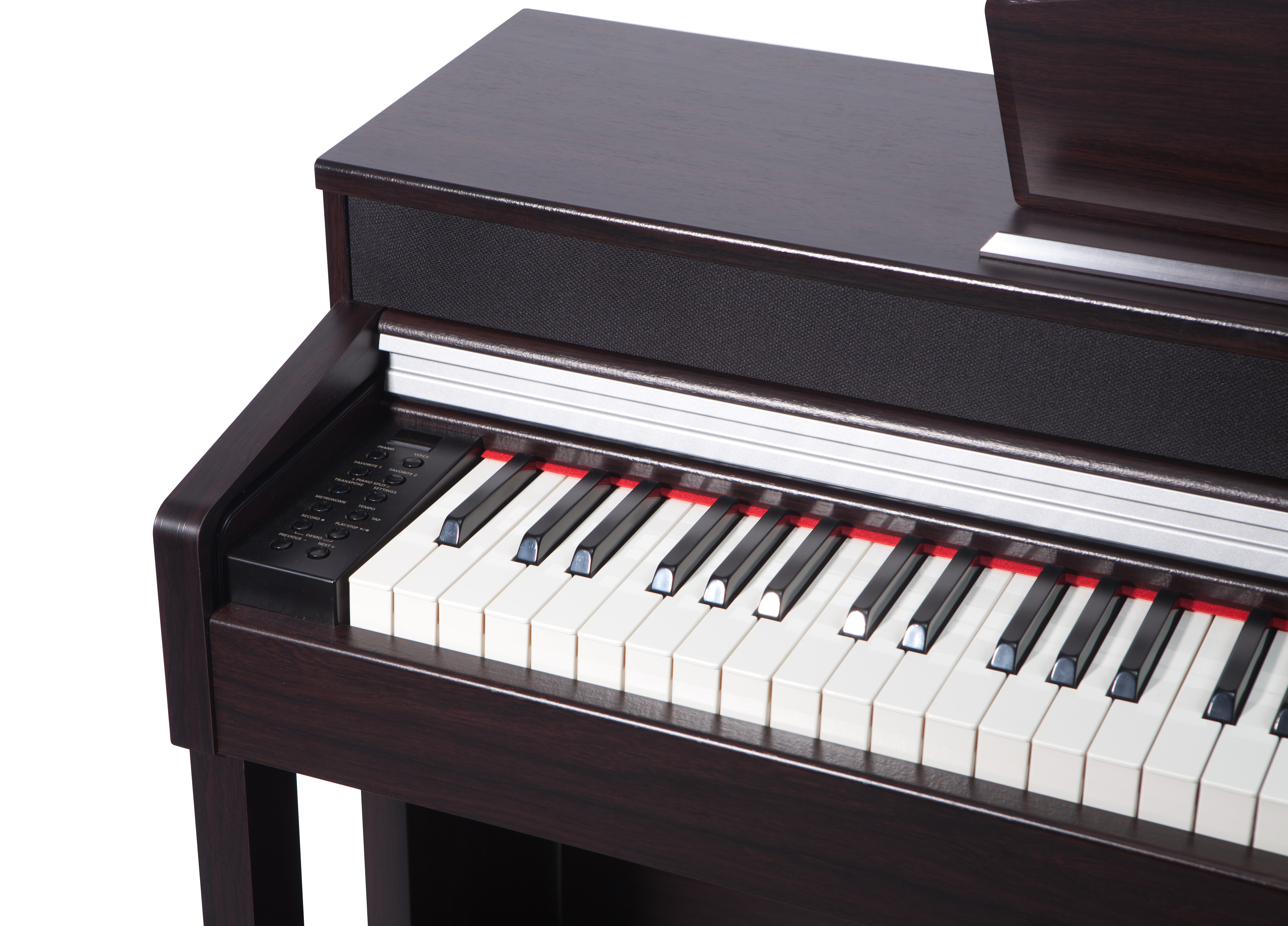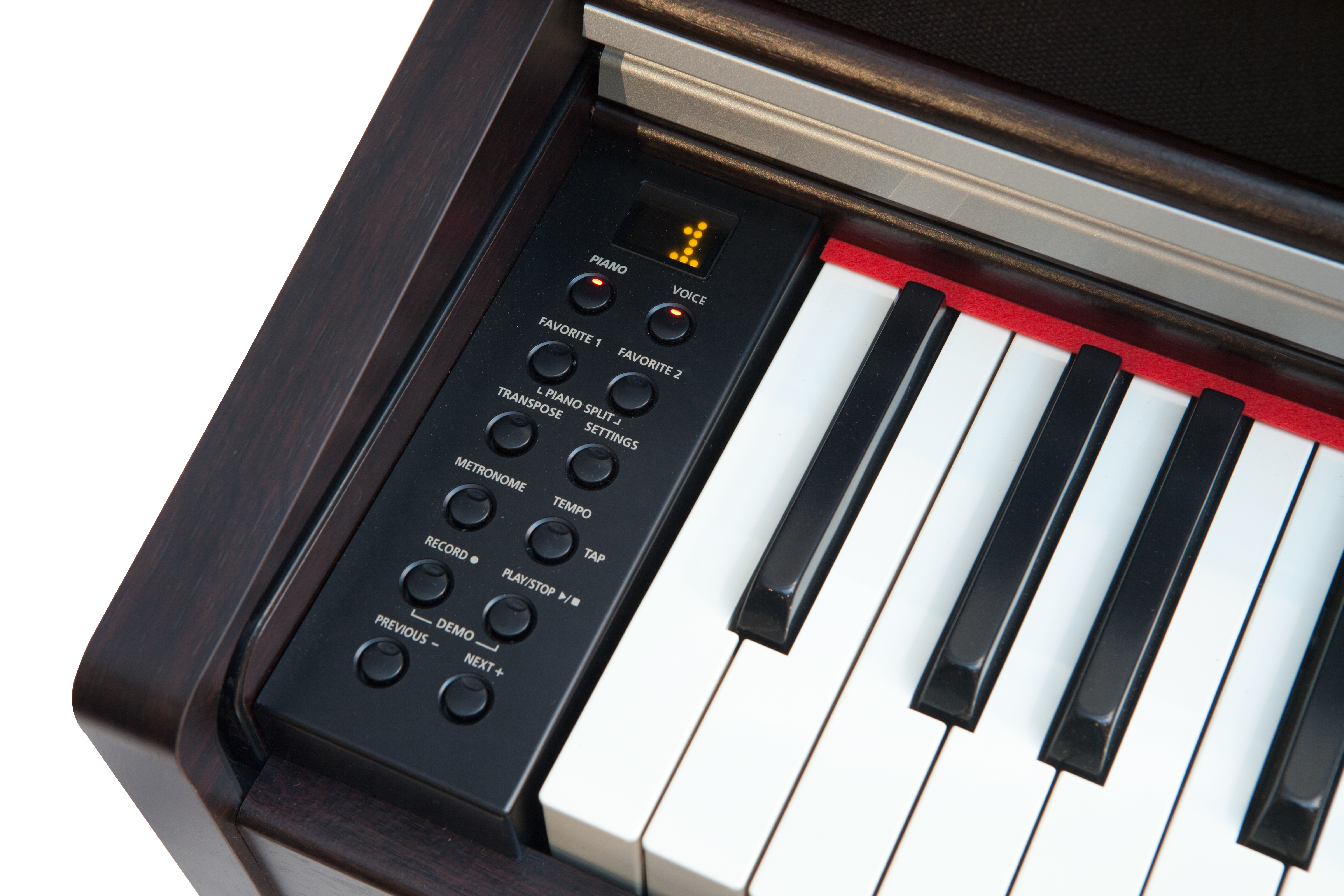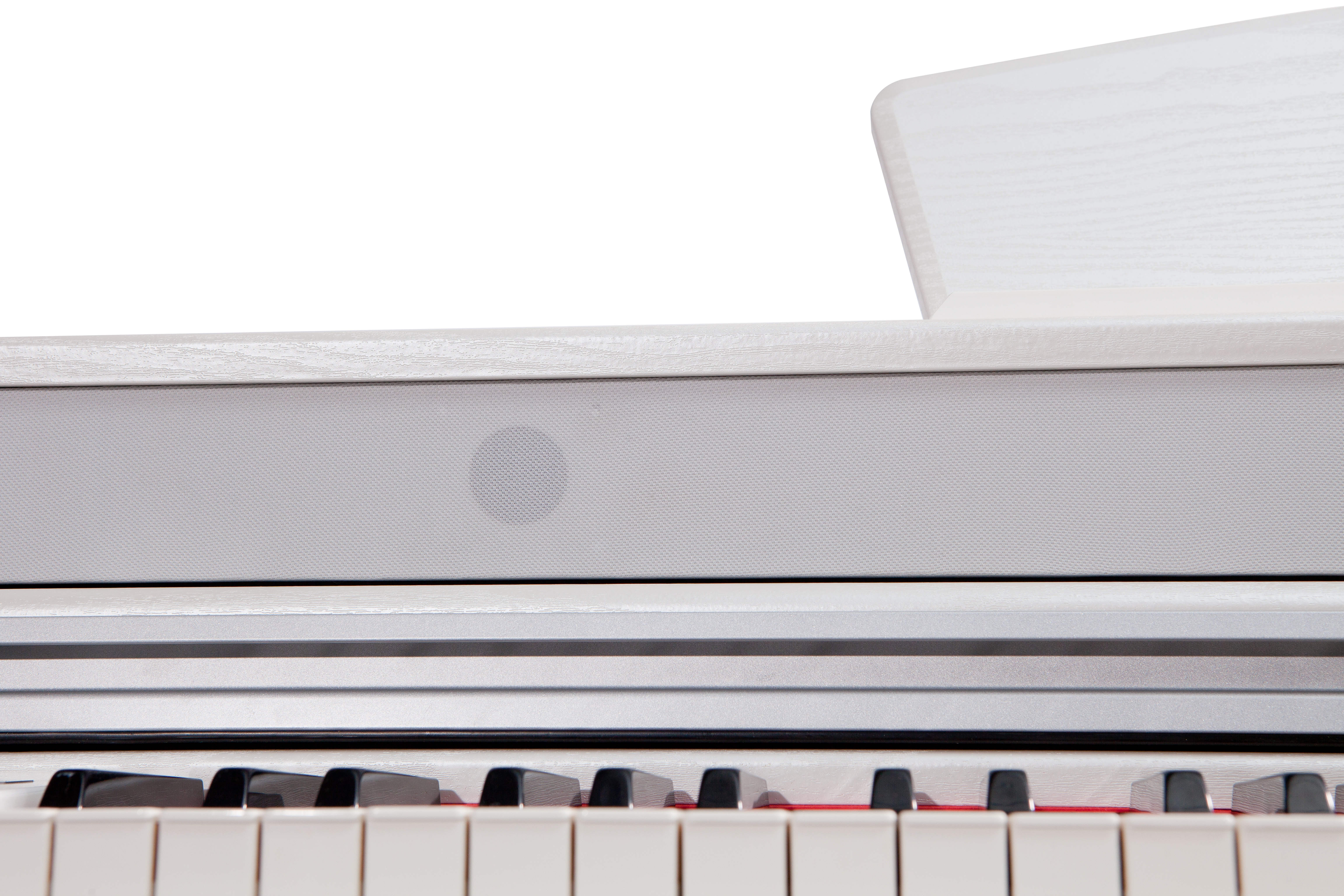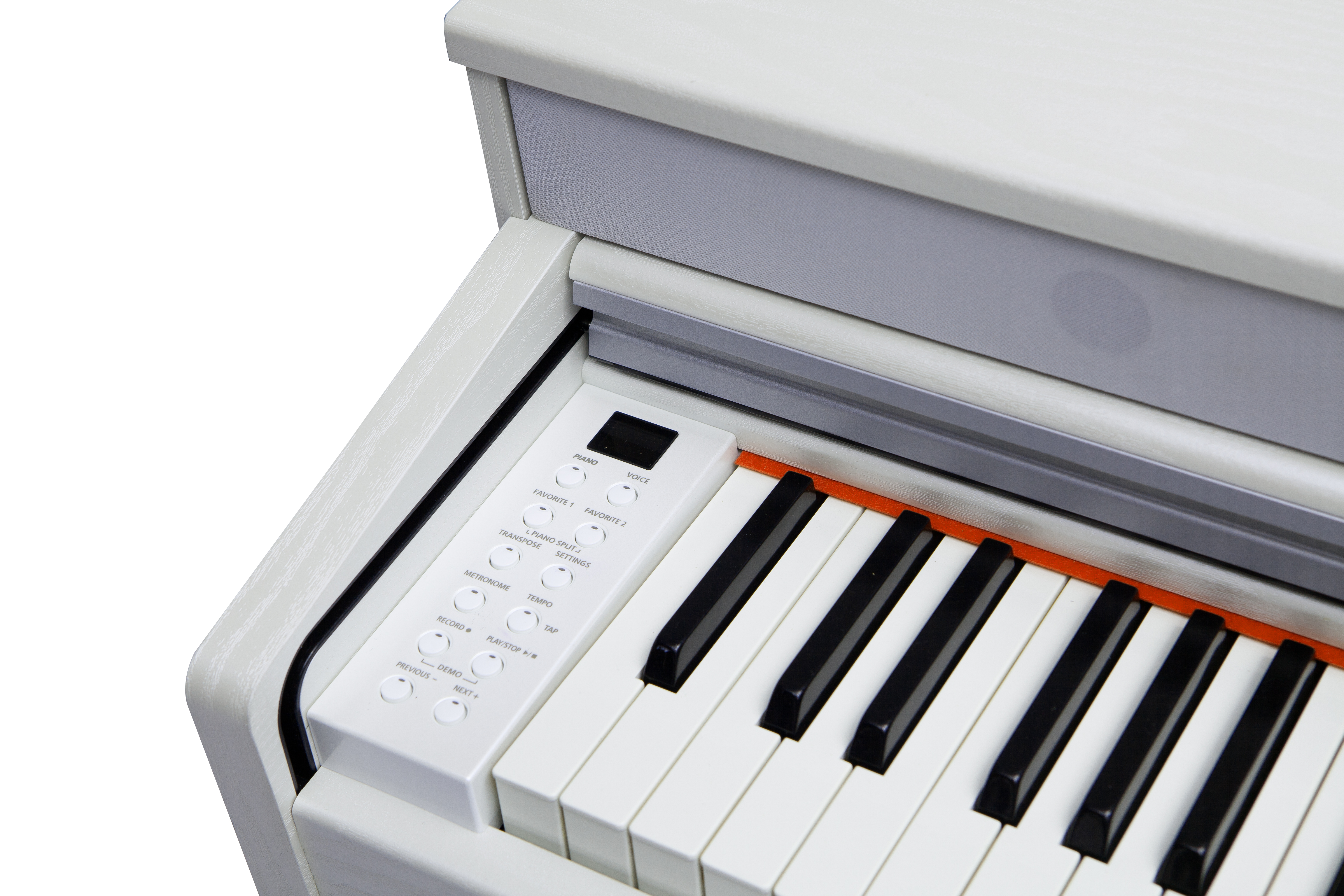 Spinet-stye cabinet available in satin rosewood or white finishes, featuring a built-in music stand, slide-out fallboard and powered by a 45 Watt 4-speaker, stereo sound system.