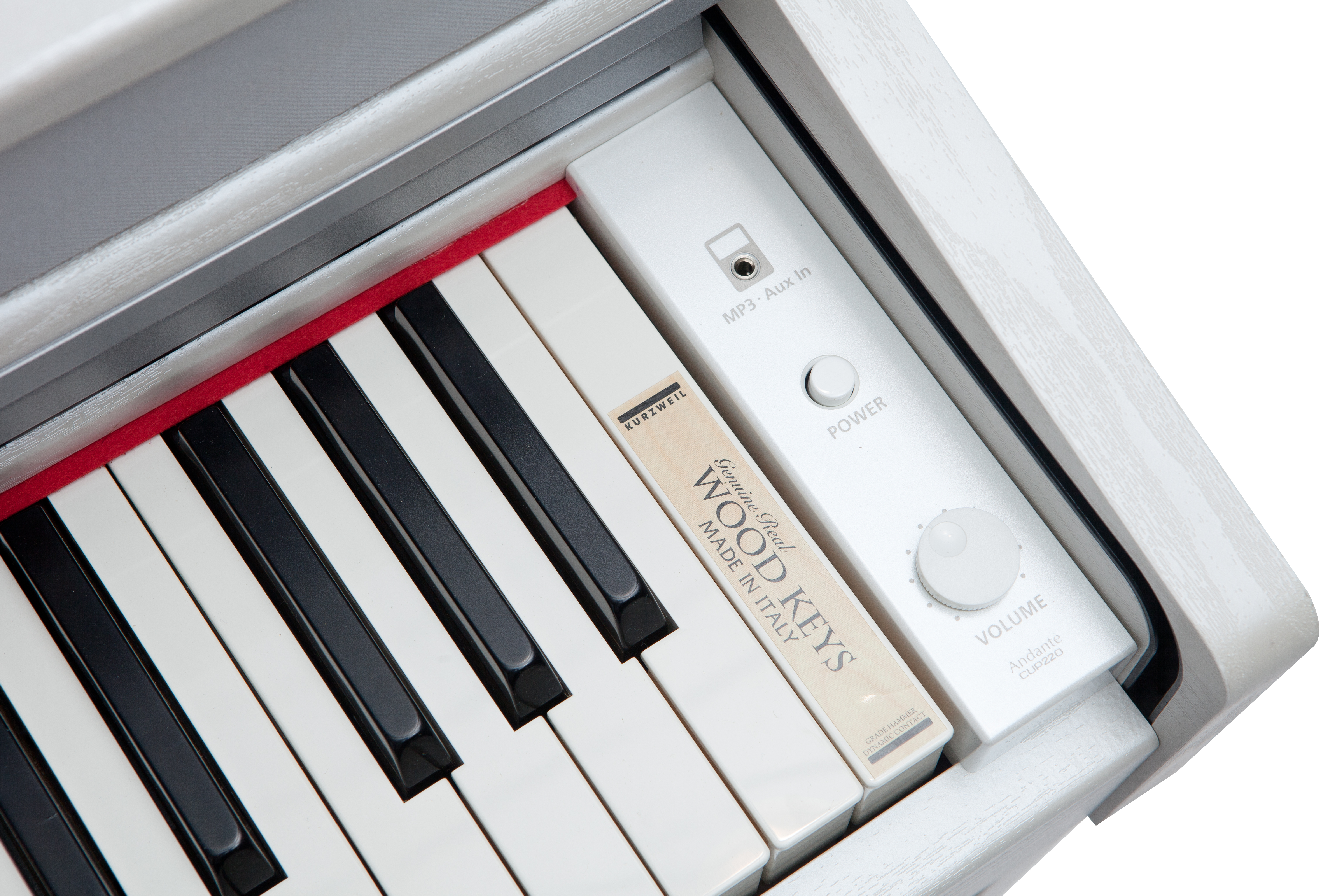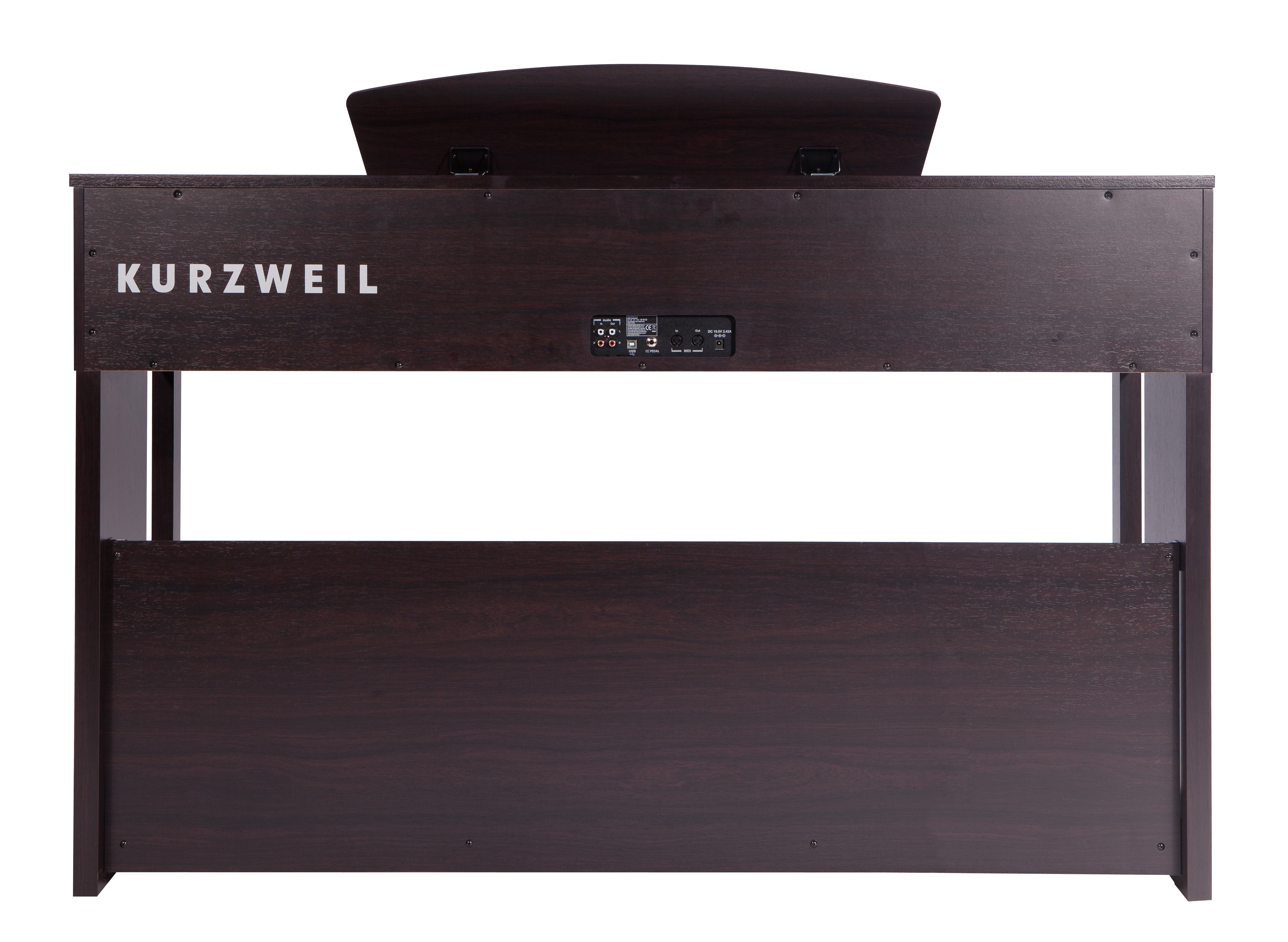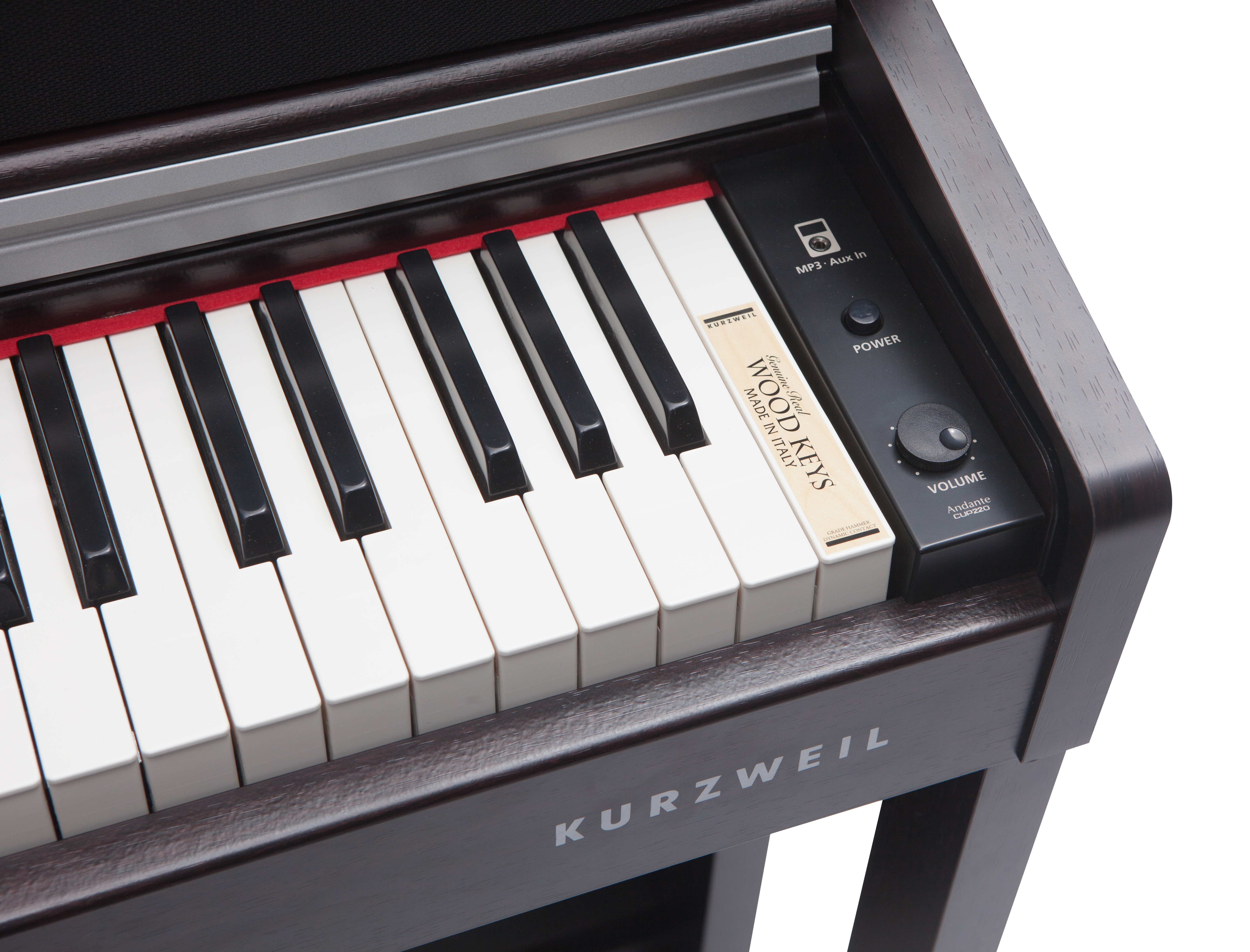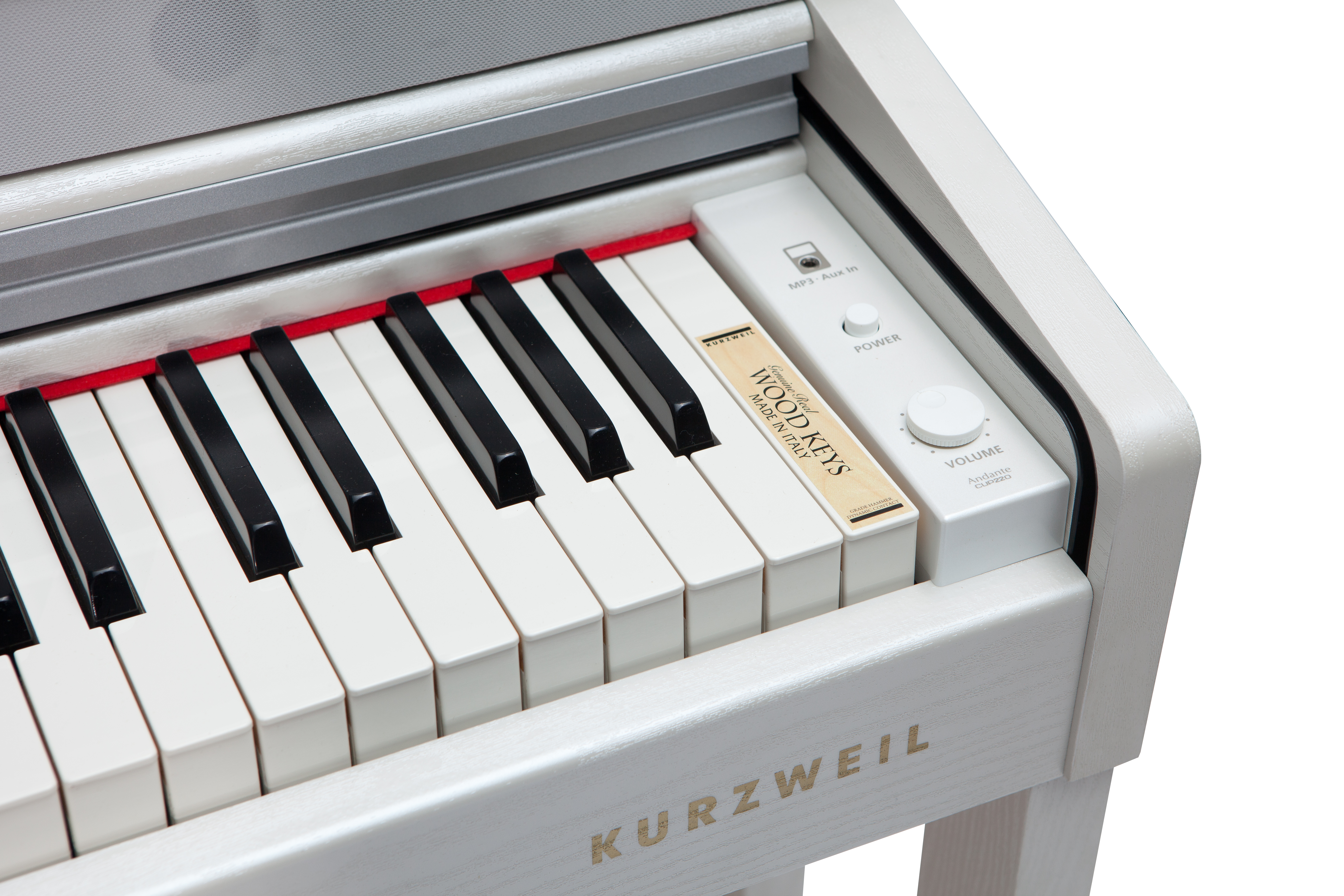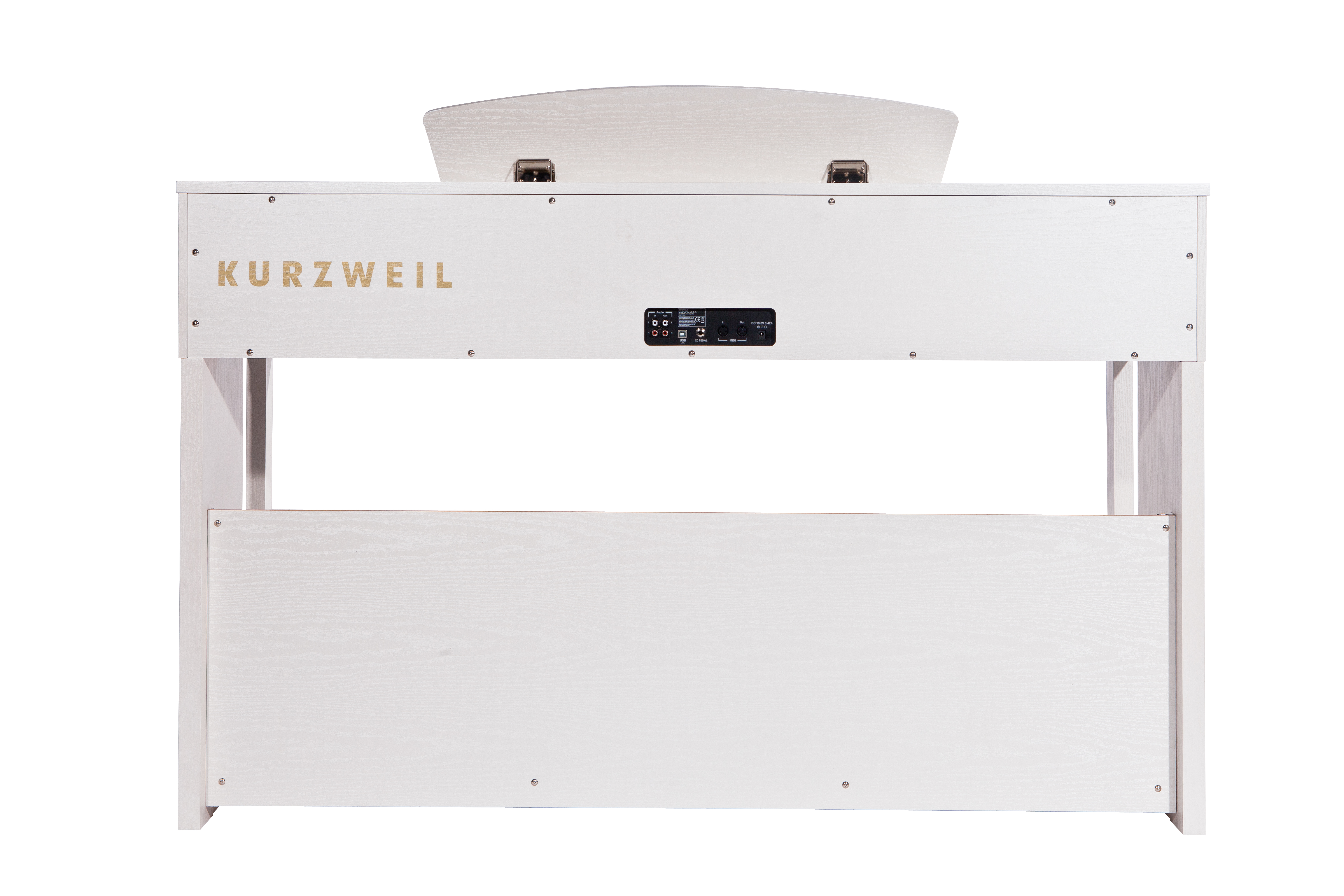 Spinet-stye cabinet available in satin rosewood or white finishes, featuring a built-in music stand, slide-out fallboard and powered by a 45 Watt 4-speaker, stereo sound system.