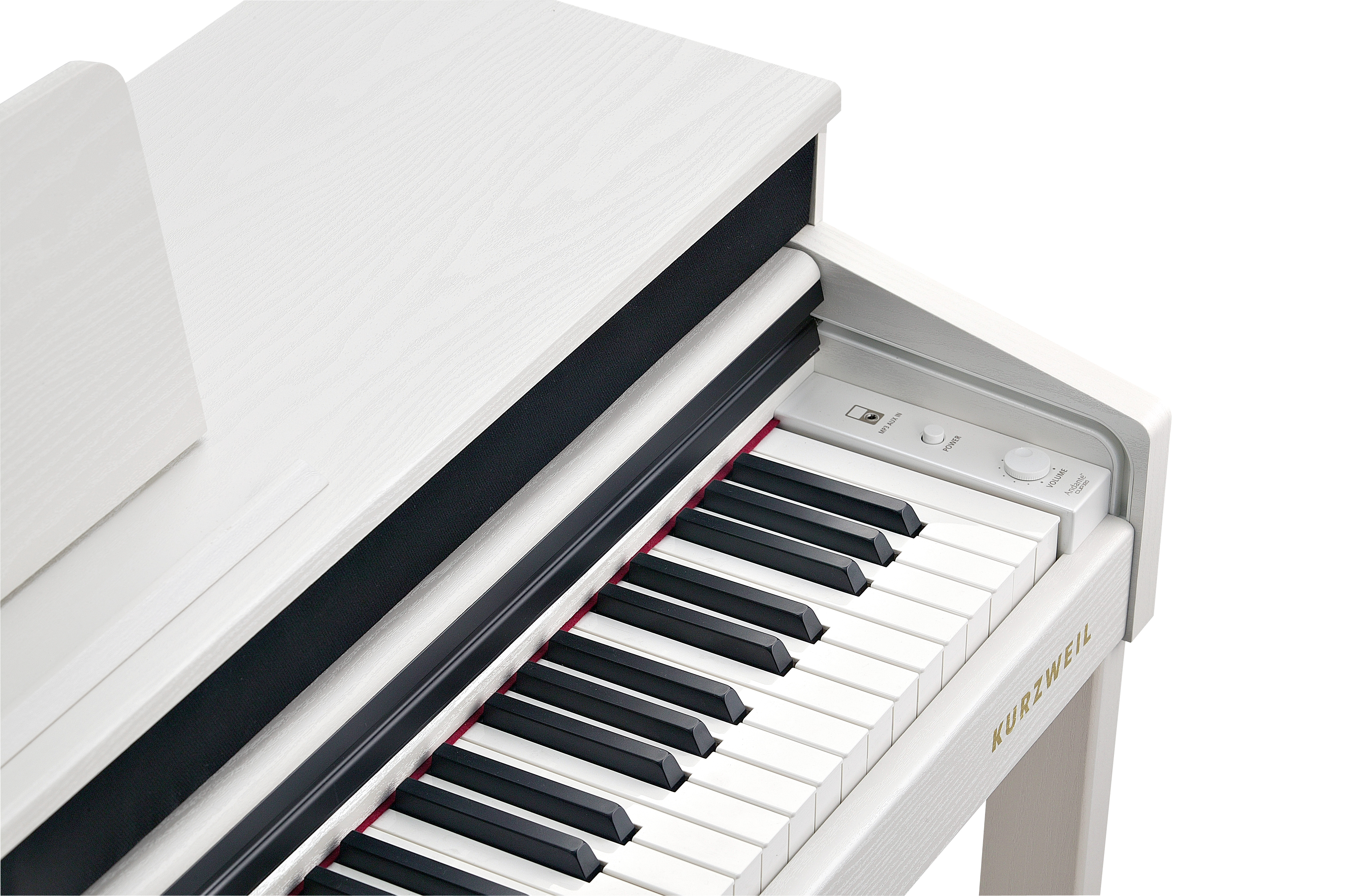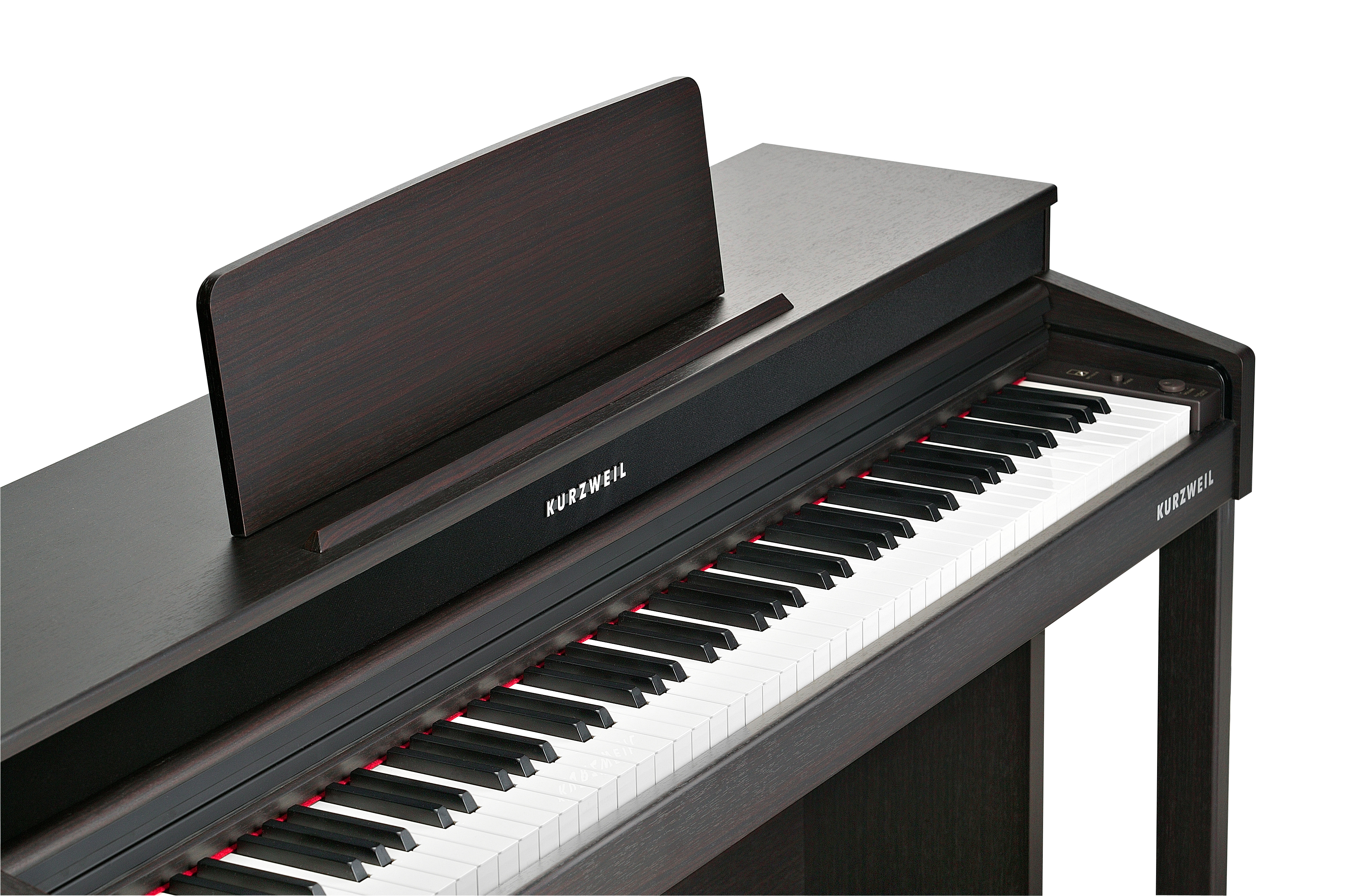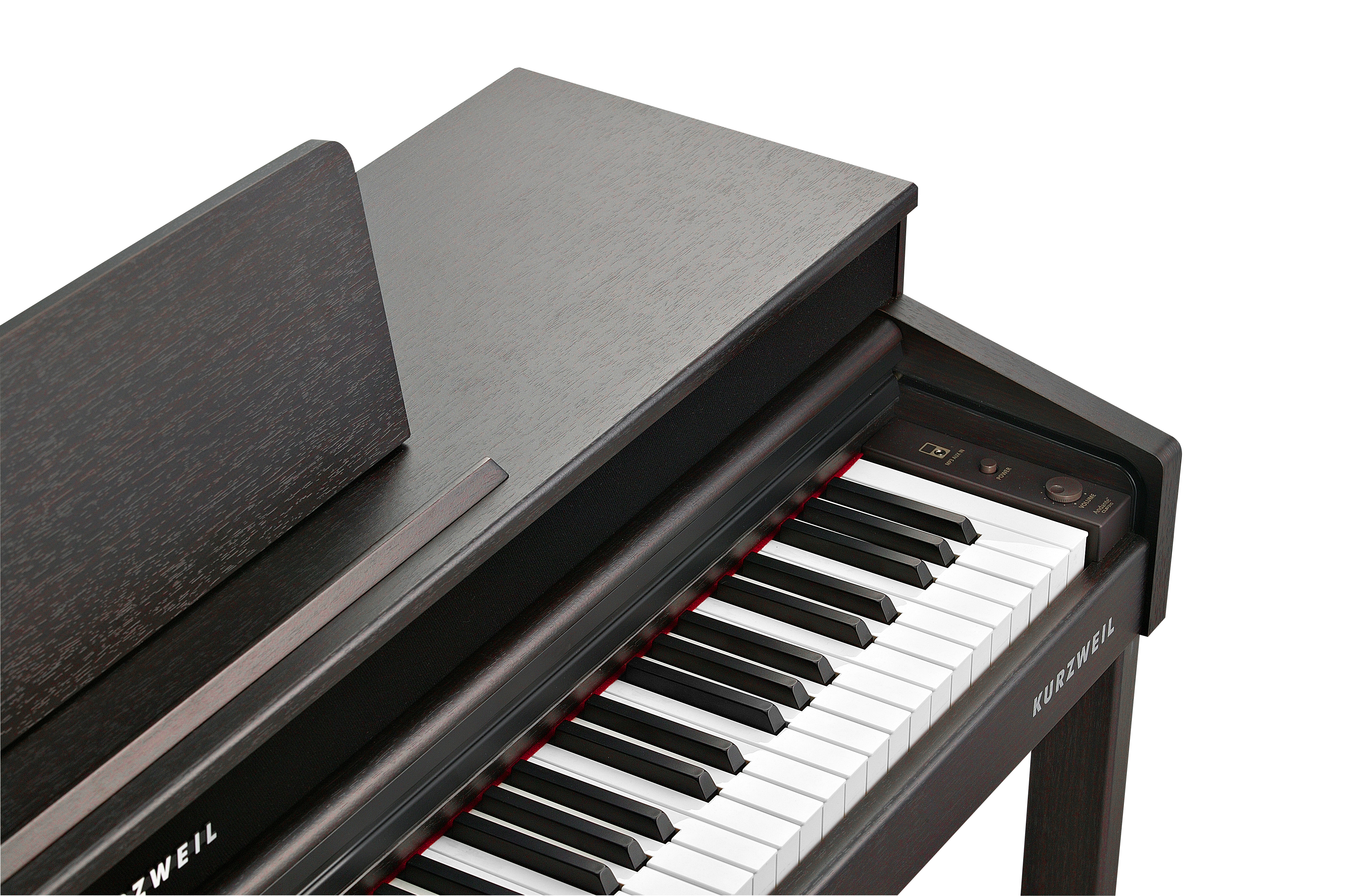 Spinet-style cabinet available in satin rosewood or white finishes, featuring a built-in music stand, slide-out fallboard and powered by a dual 25 Watt 4-speaker, stereo sound system.