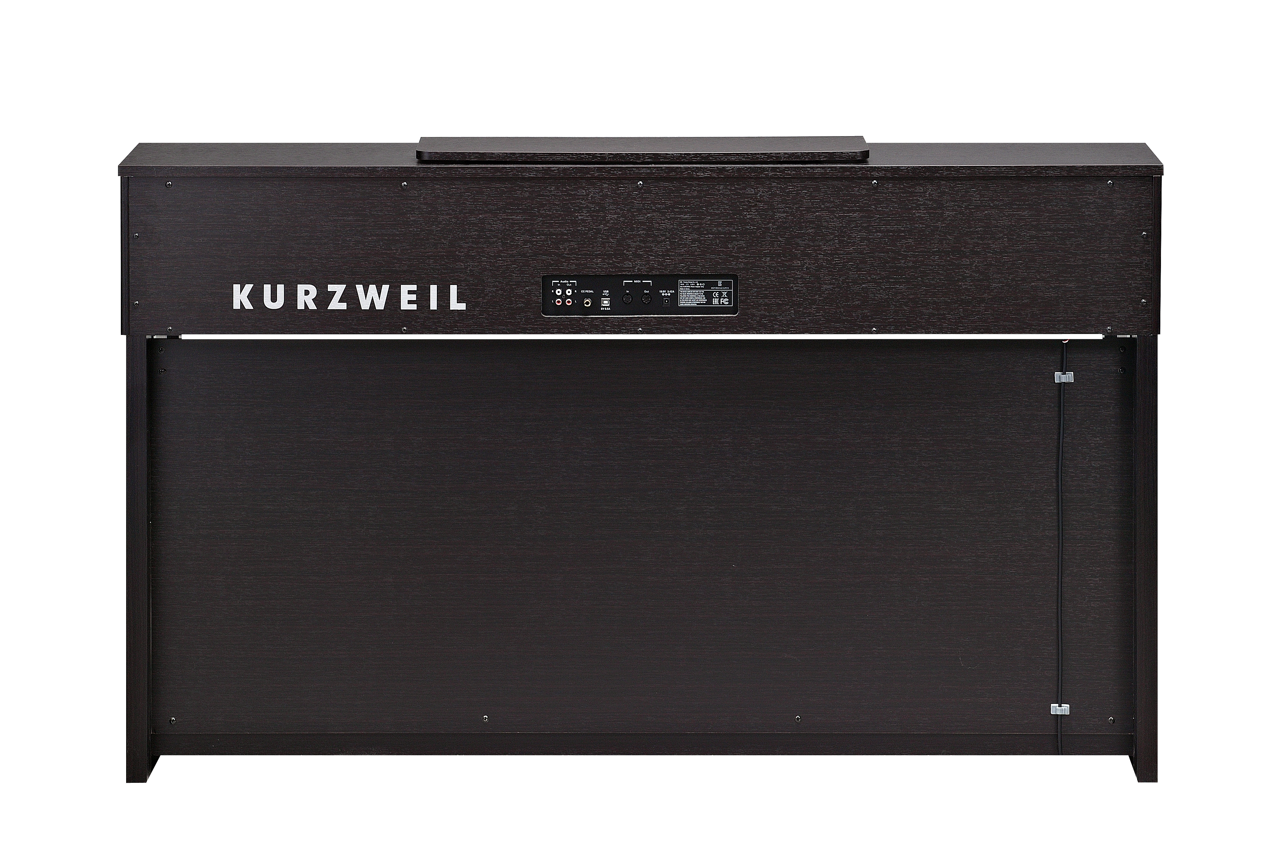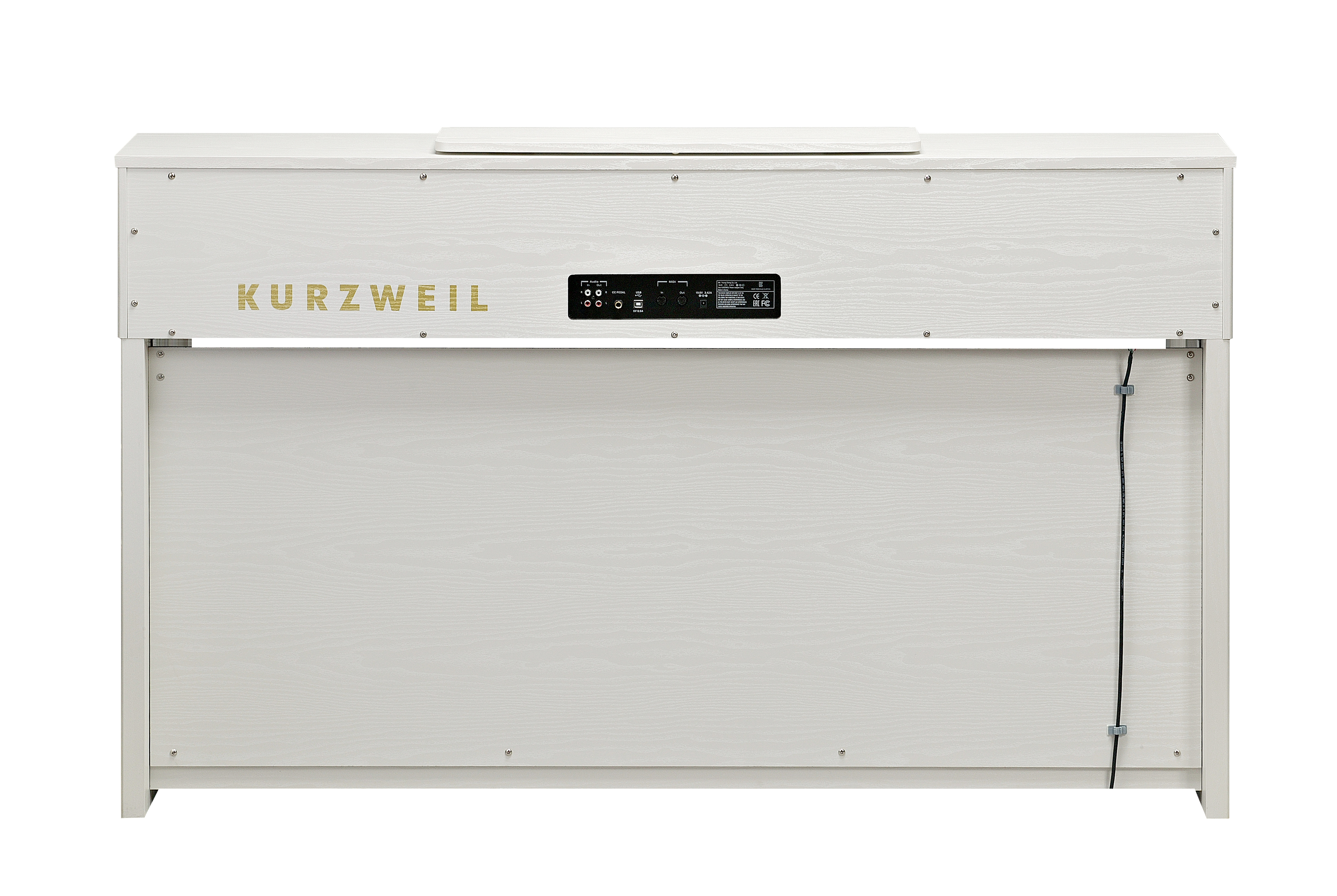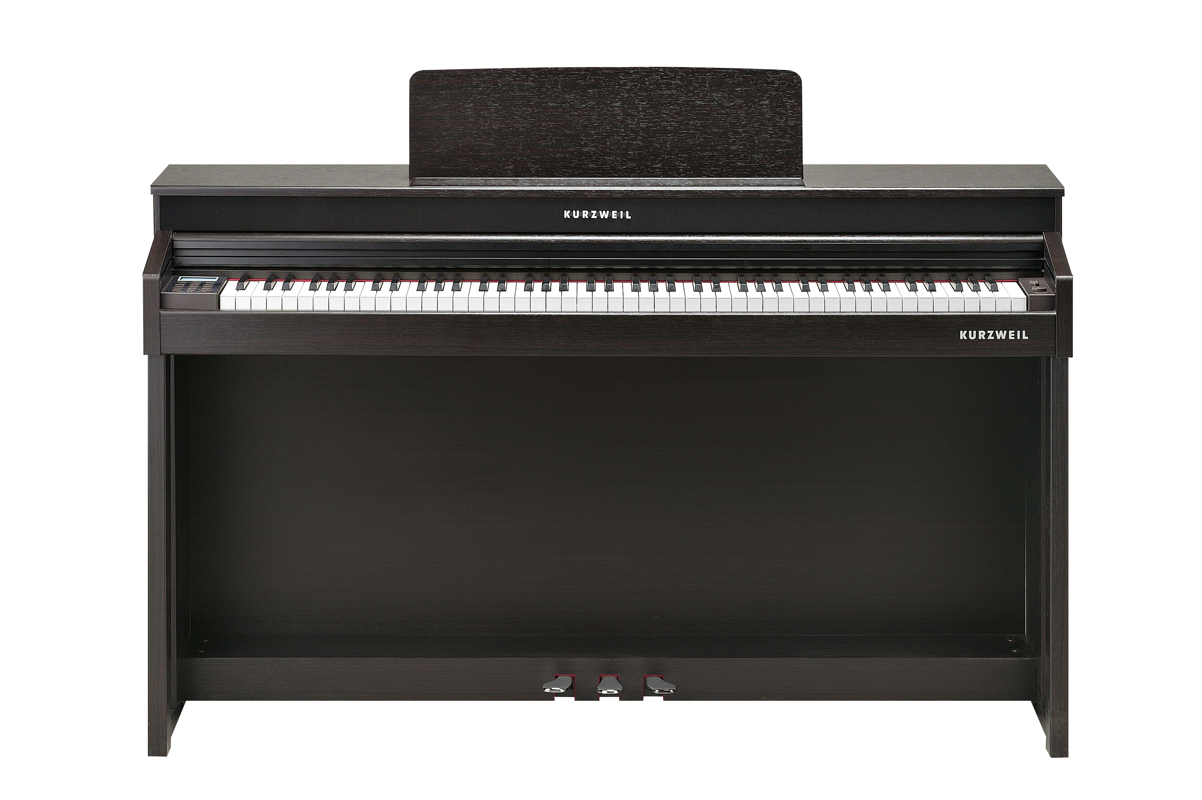 Spinet-style cabinet available in satin rosewood or white finishes, featuring a built-in music stand, slide-out fallboard and powered by a dual 25 Watt 4-speaker, stereo sound system.