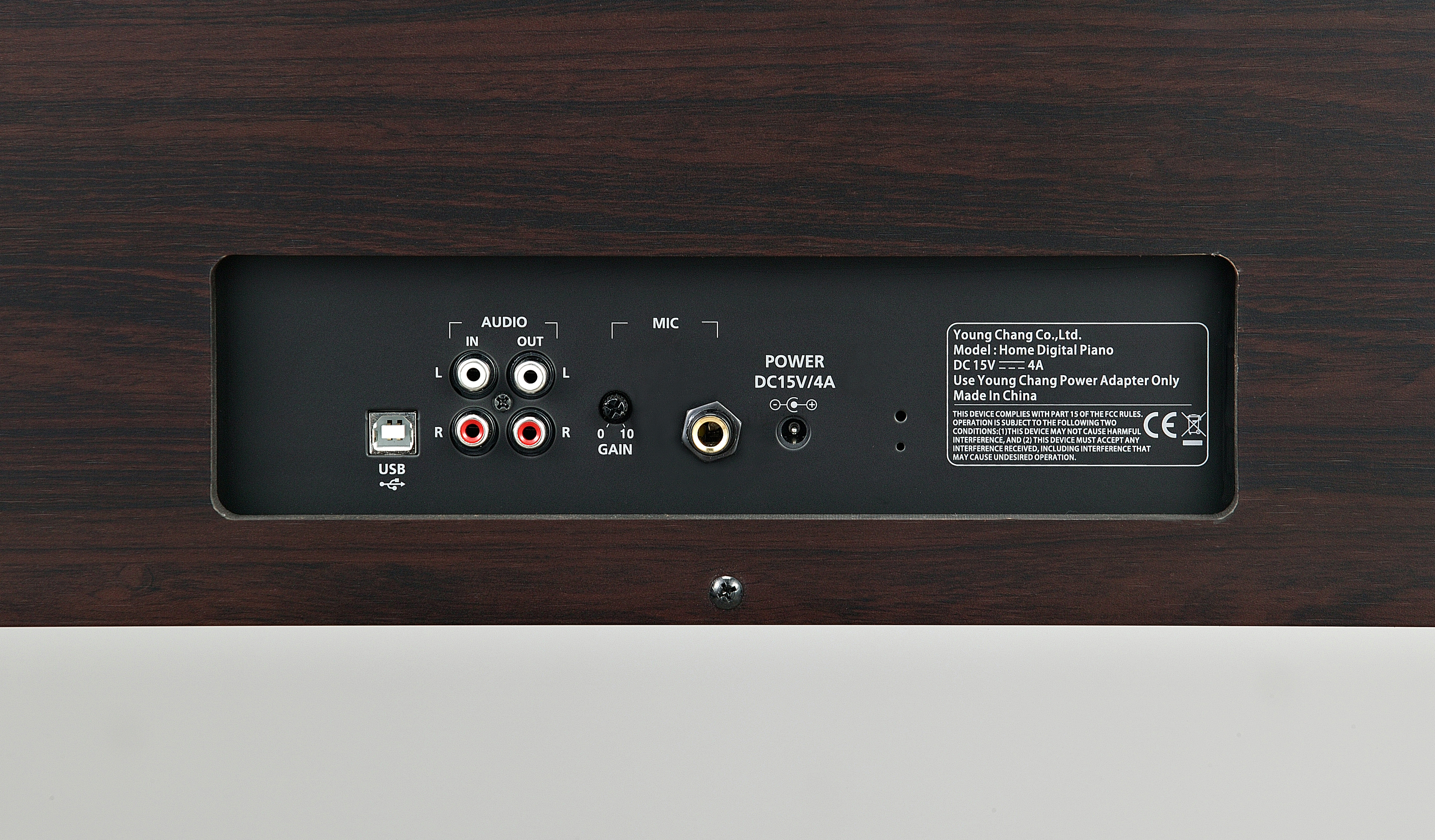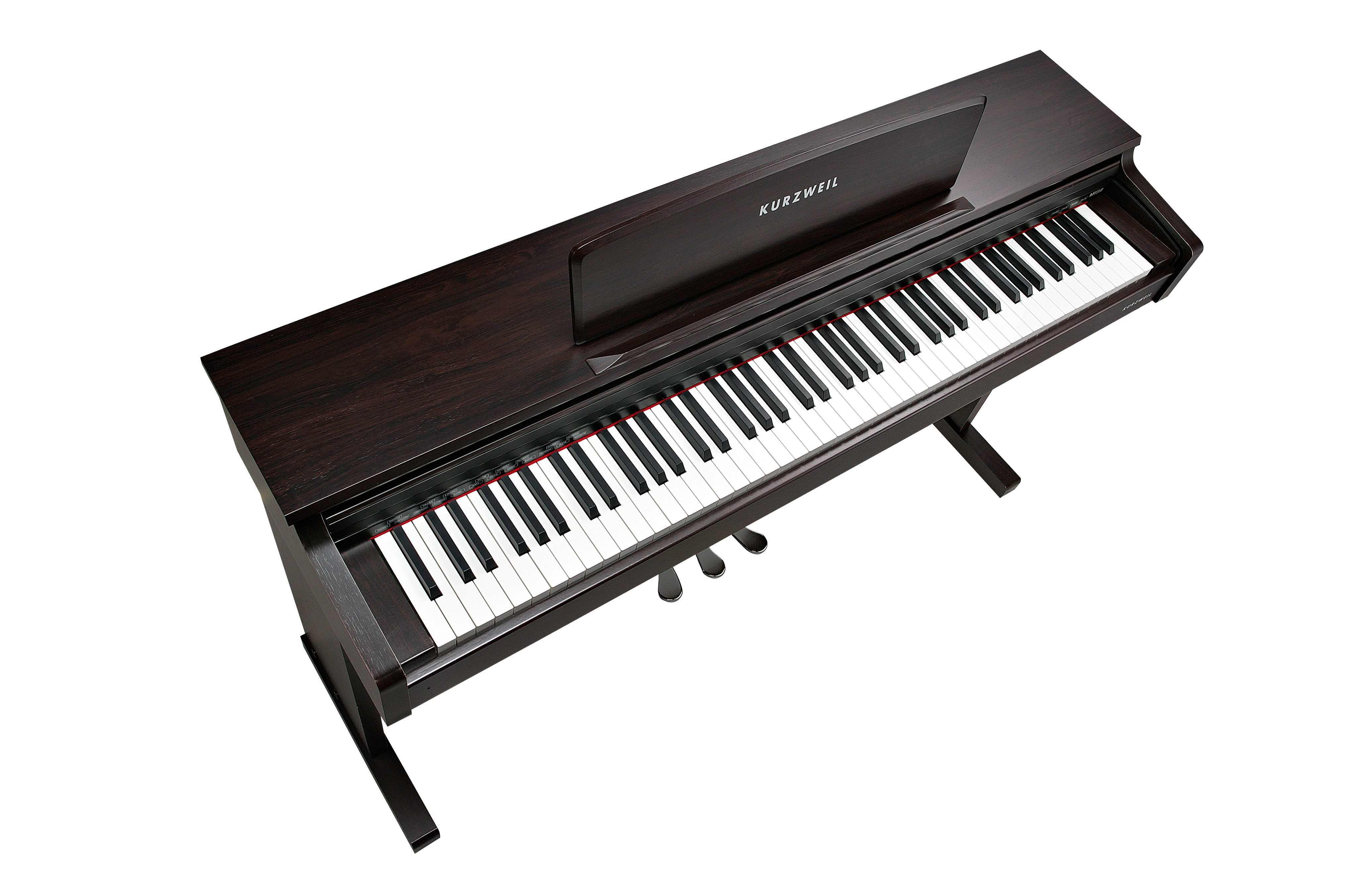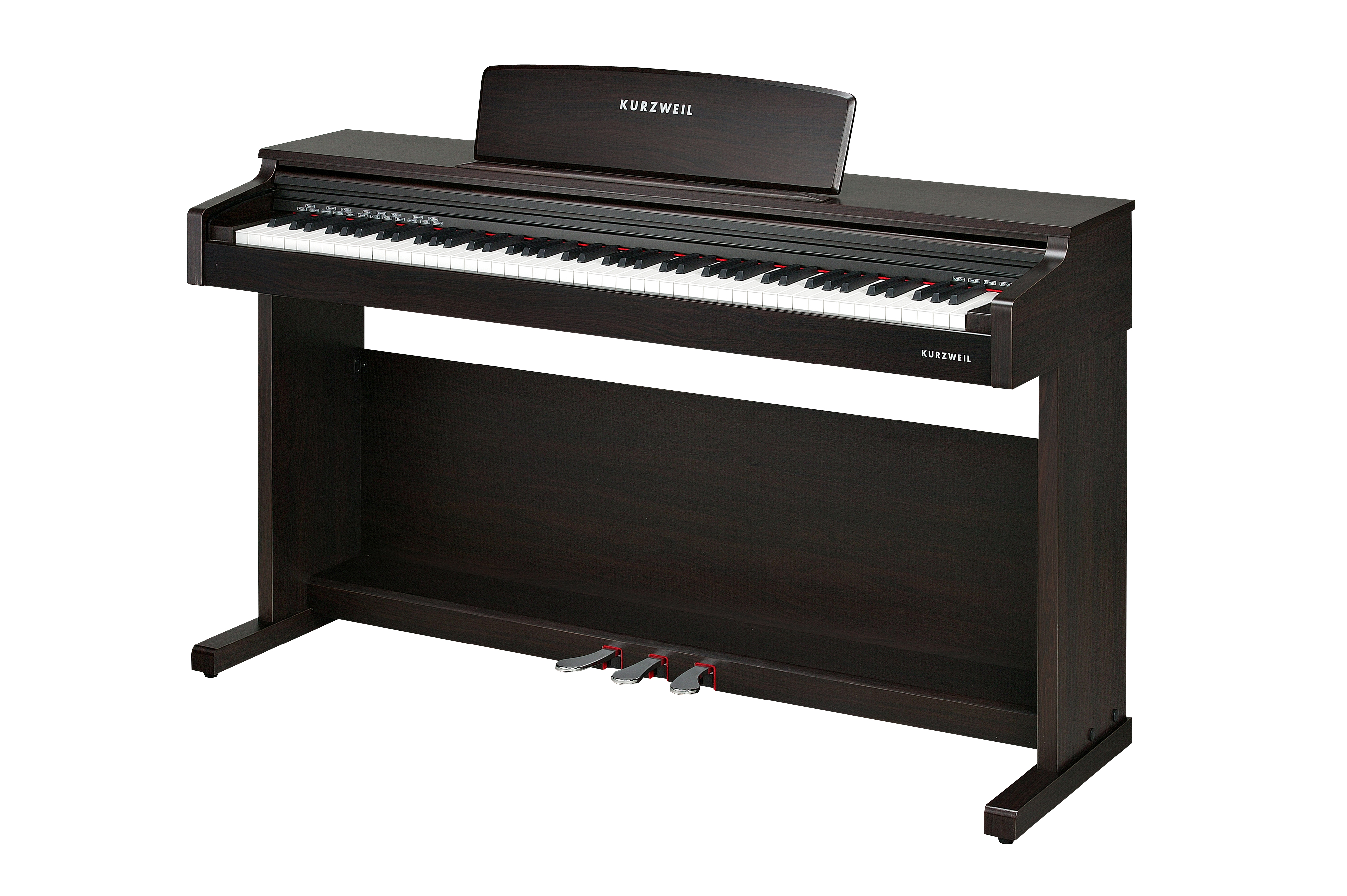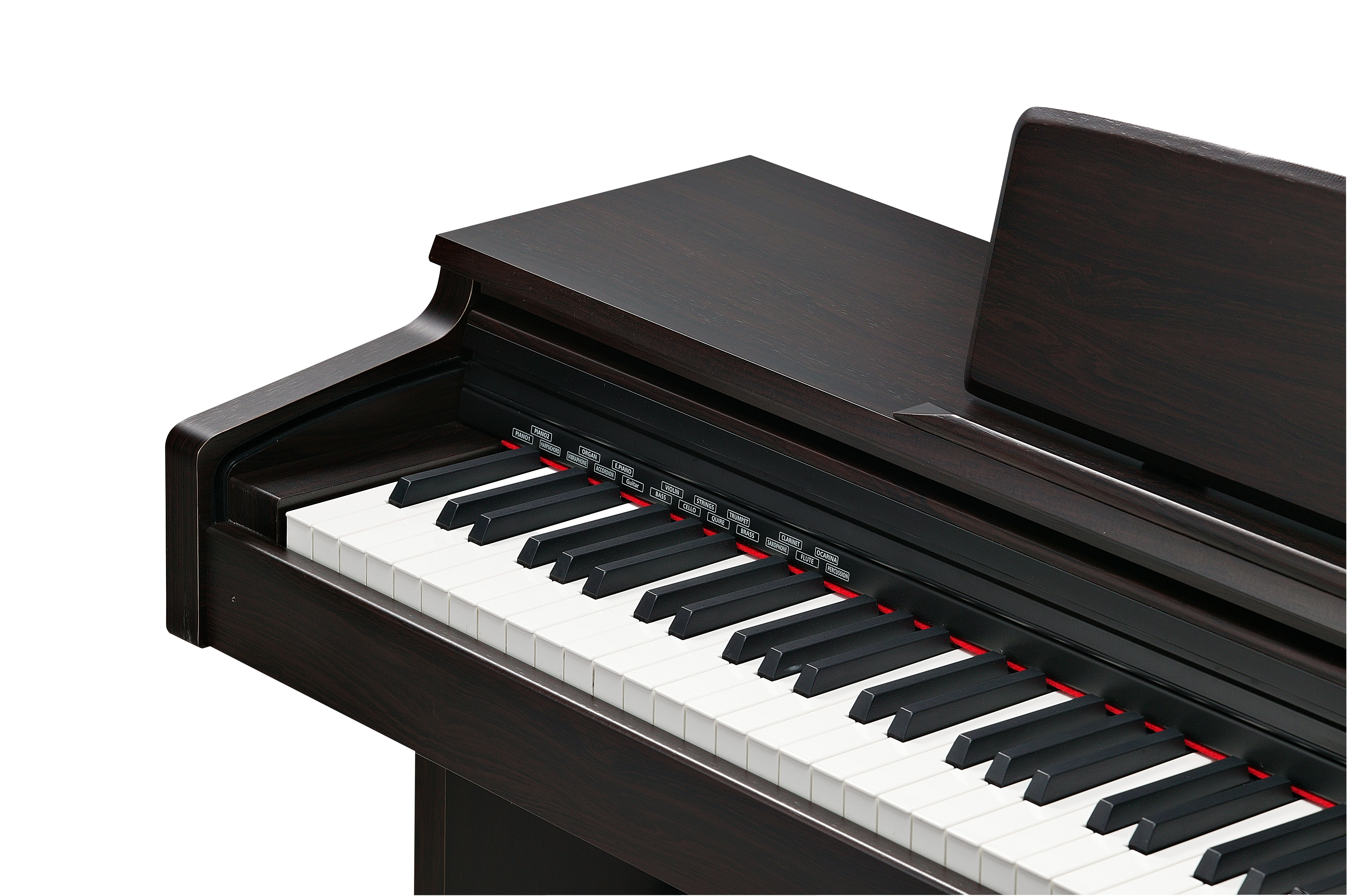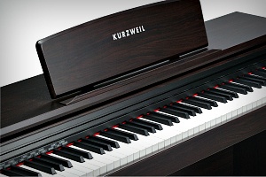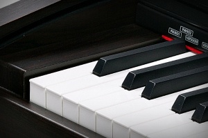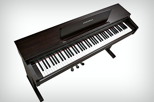 Spinet-stye cabinet available in a simulated rosewood finish, featuring a 40 Watt, 2-speaker, stereo sound system, built-in music stand and slide-out fallboard.