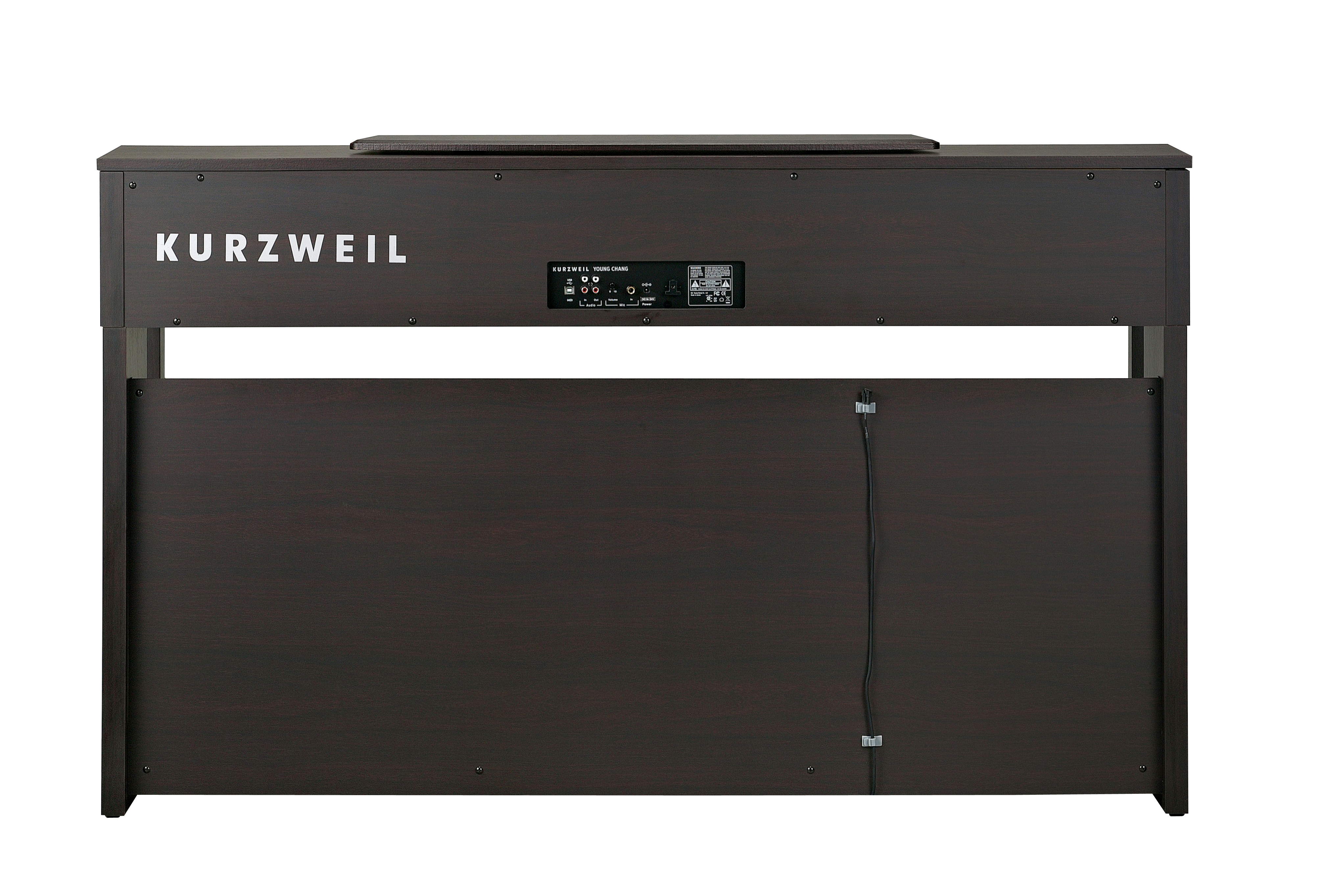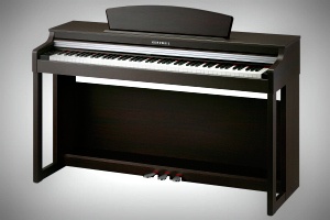 Spinet-style cabinet available in simulated rosewood or white finishes, featuring a 20 Watt, 2-speaker, stereo sound system, built-in music stand and slide-out fallboard.
