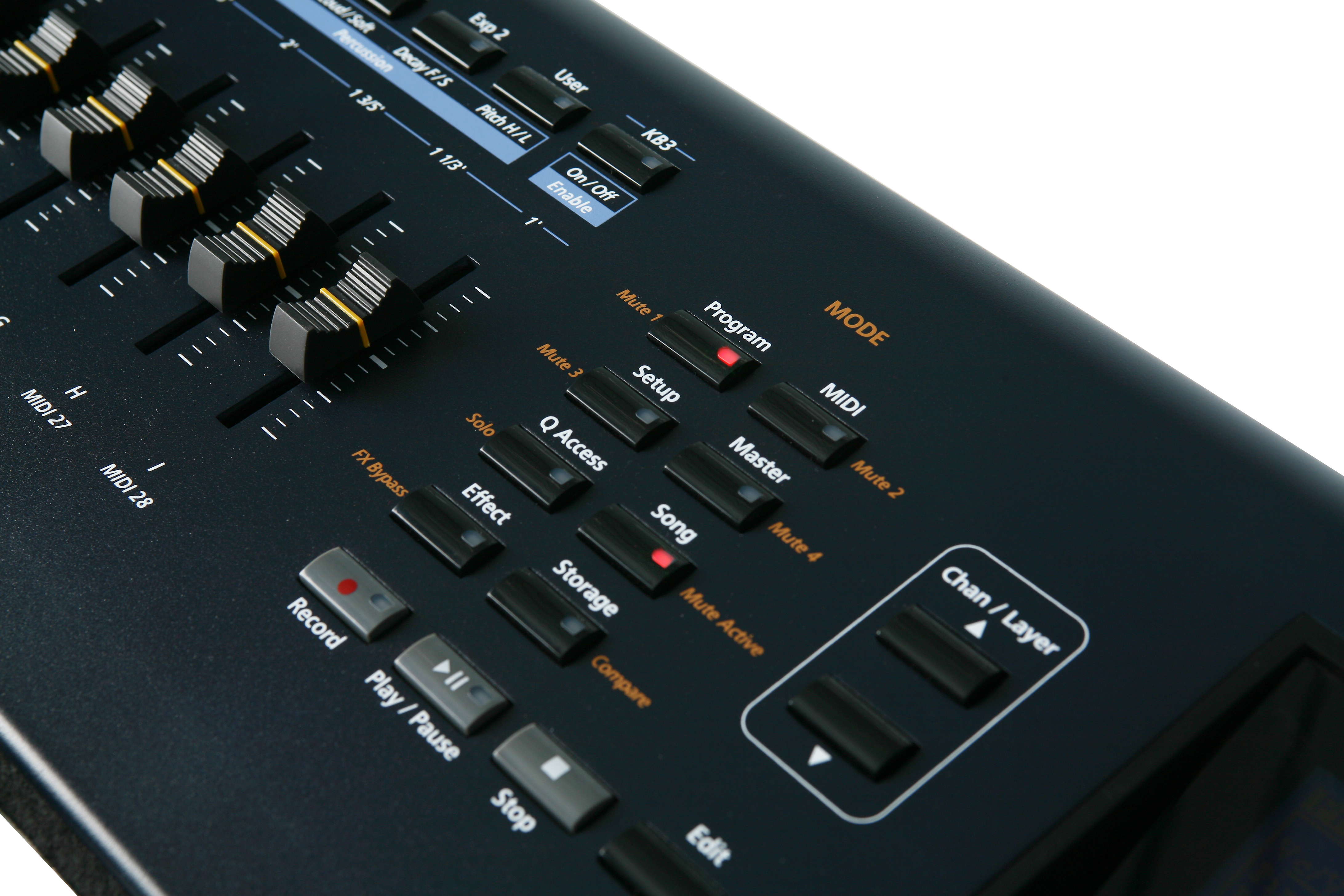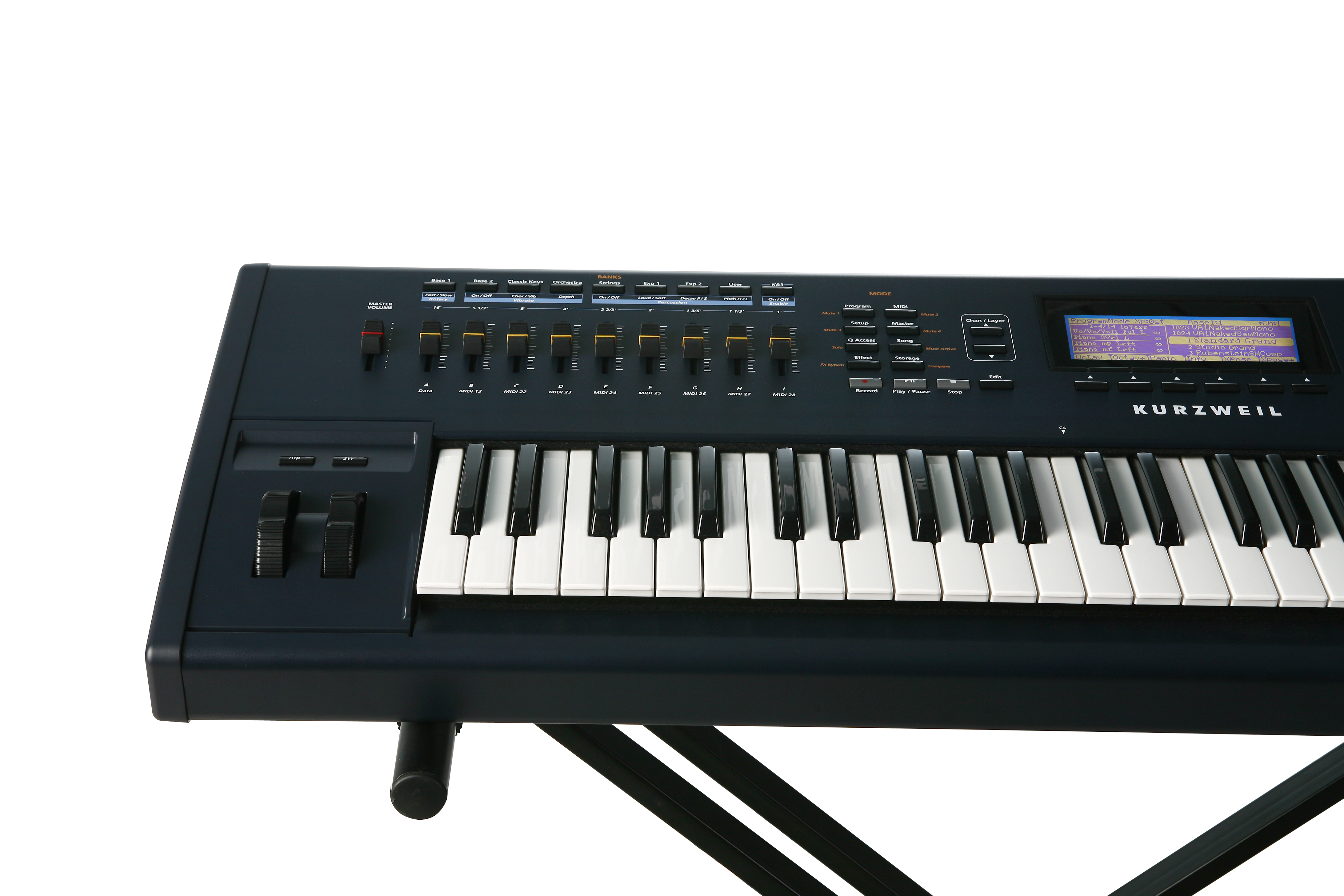 For more vintage firepower, the PC361 is equipped with the most advanced version of Kurzweil’s widely lauded KB3 Mode tonewheel organ simulator, which screams, sputters and sizzles just like the original. In addition to newly developed Leslie effects, and a new bank of B3 programs, we’ve also included sounds from classic combo organs. The PC361’s 9 sliders provide real-time drawbar control.