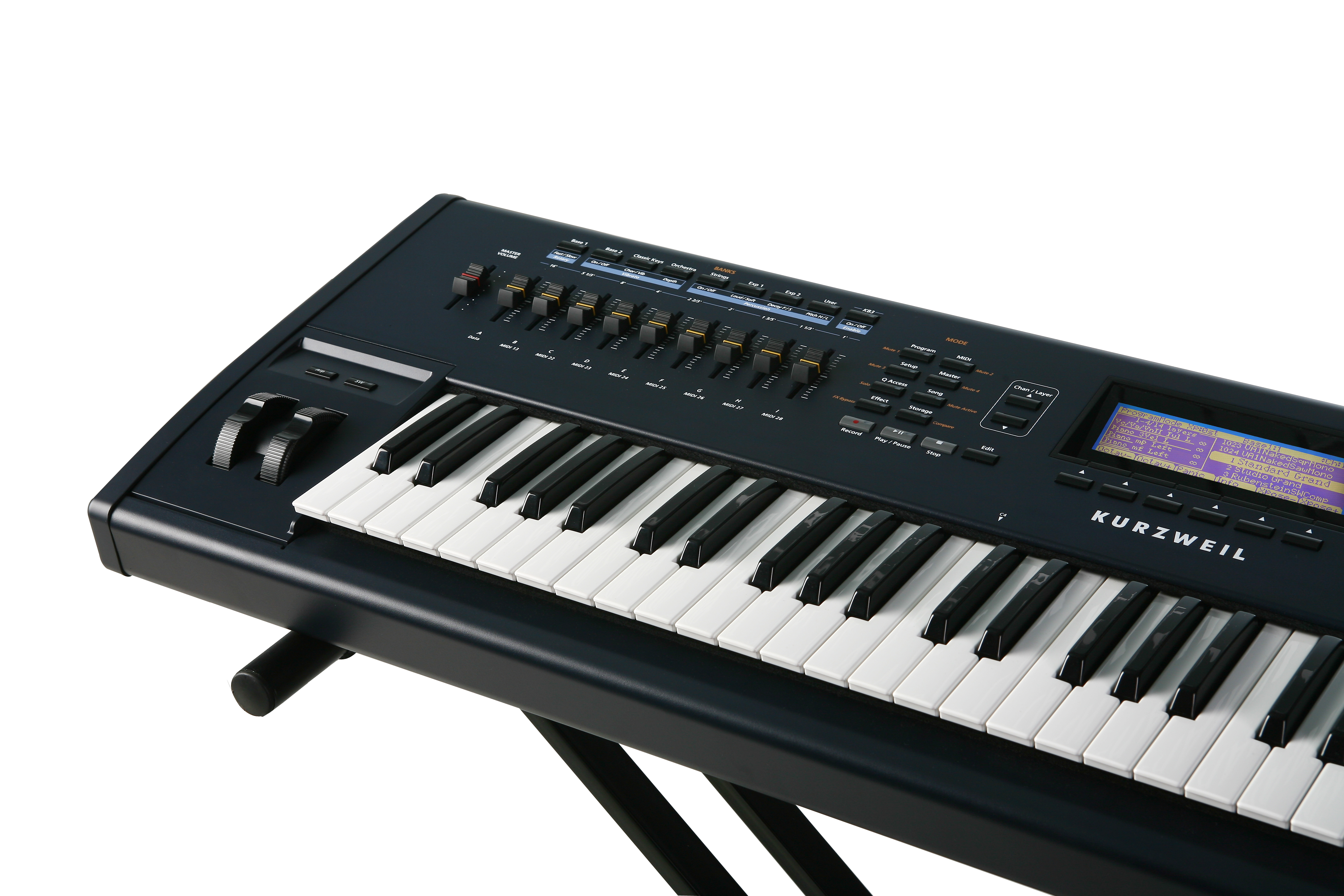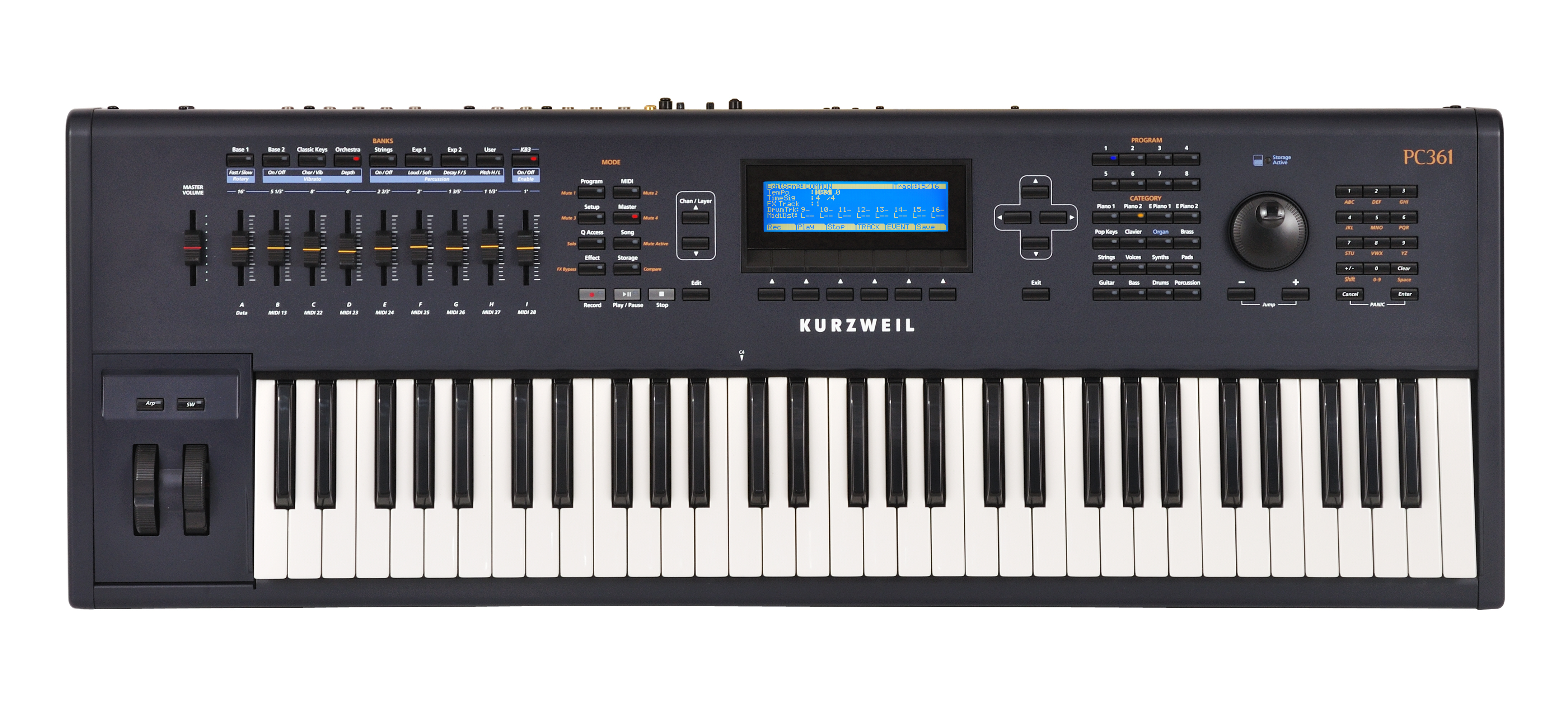 The PC361 offers an enormous sound set of over 850 programs, raising the bar once again for both audio quality and variety. With the best samples in the industry, and a powerful, responsive synth engine breathing life into them, you’ll feel like you’re playing an actual instrument, not just playing samples. Of course there’s the famous Kurzweil Triple Strike Piano, with dozens of variations to accommodate every kind of player. All of the basic sounds – basses, guitars, drums, horns and synths – have been painstakingly programmed to reflect the needs of today’s professional players, representing a broad selection of styles and flavors from the ’60s, ’70s, ’80s, ’90s and today.