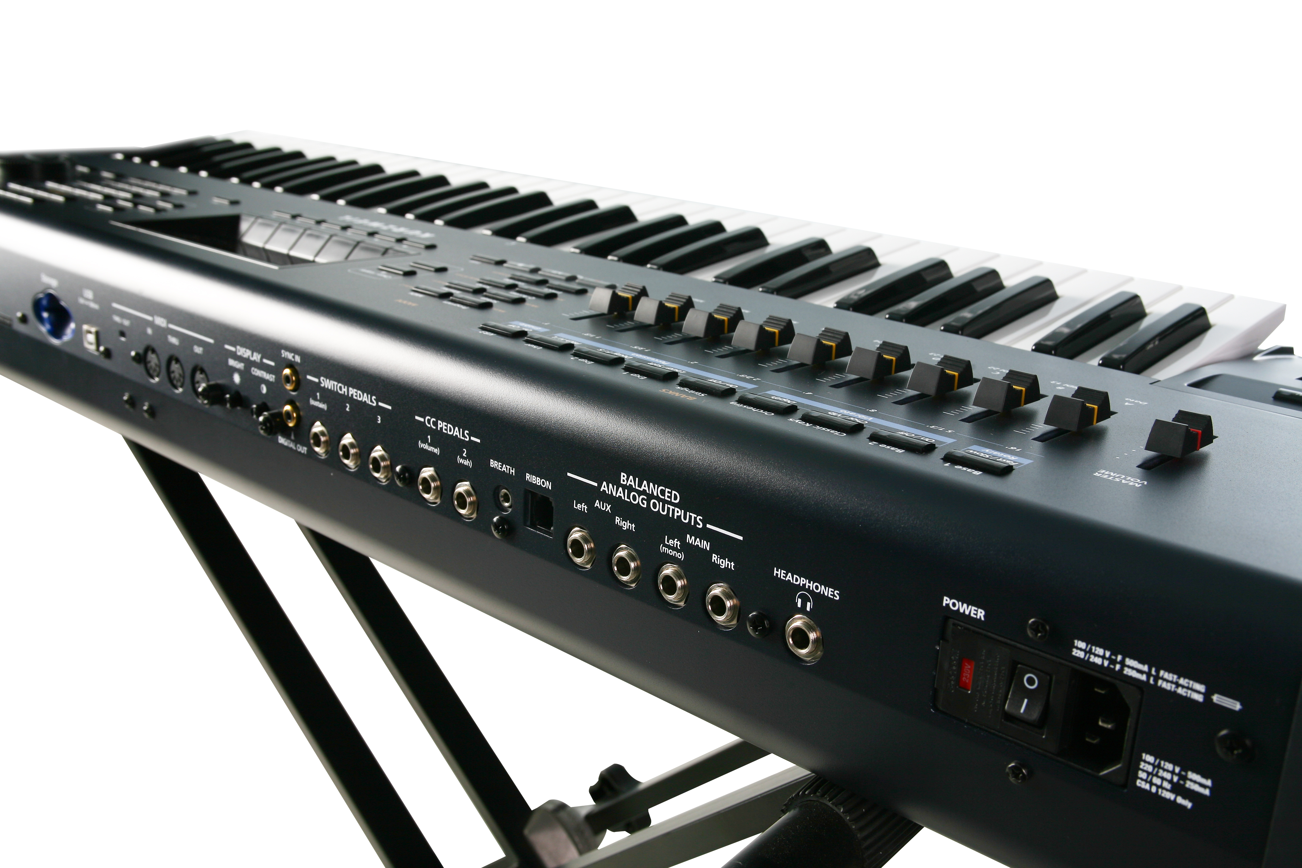 | Controllers: | Pitch wheel, modulation wheel, 9 front panel sliders/drawbar controllers, 10 front panel switches (momentary or toggle, software selectable), 3 switch pedal input, 2 continuous control pedal inputs, mono pressure, Super Ribbon input, breath controller input. Controller values can be “captured” and stored as part of a program. |